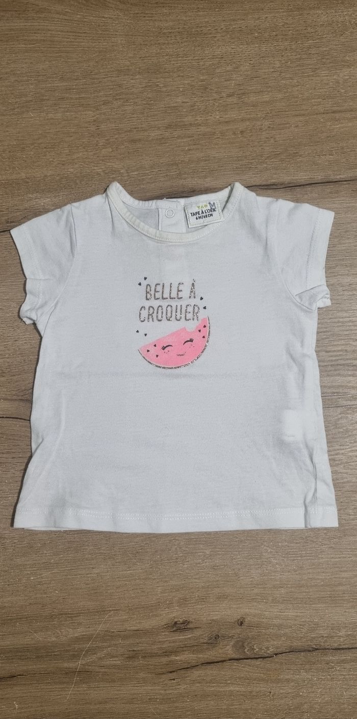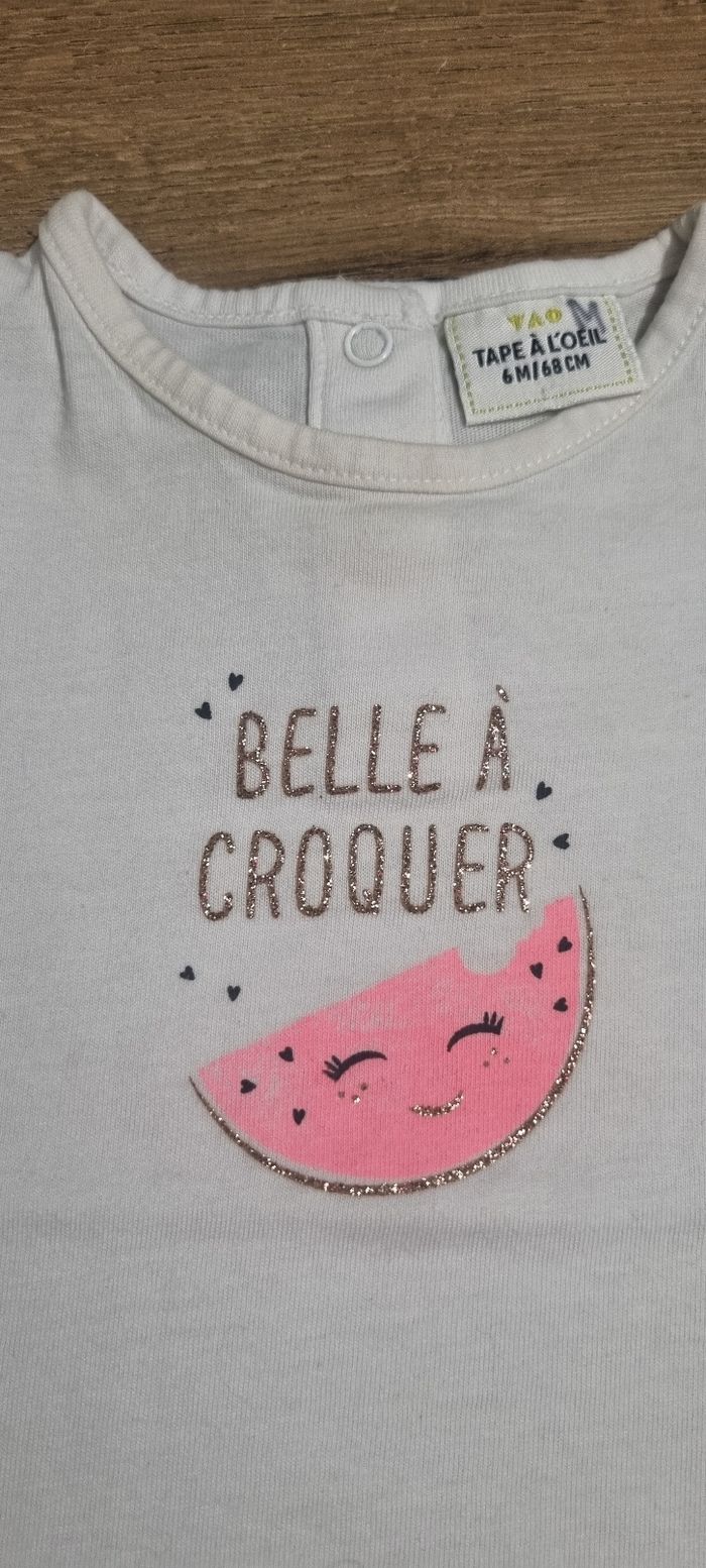 T-shirt à manches courtes Motif pastèque et écriture dorée "belle à croquer" Tape à l'œil taille 6 mois Bon état (doublure du col légèrement tâché)