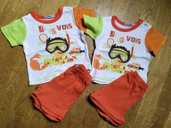 Lot composé de 2 tenues identiques pour garçons (short+t-shirt), taille 12mois. Très peu portés. Possibilité de diviser le lot 😉 #lot #lotgarcons #lookgarçon #jumeaux #chlojumeaux