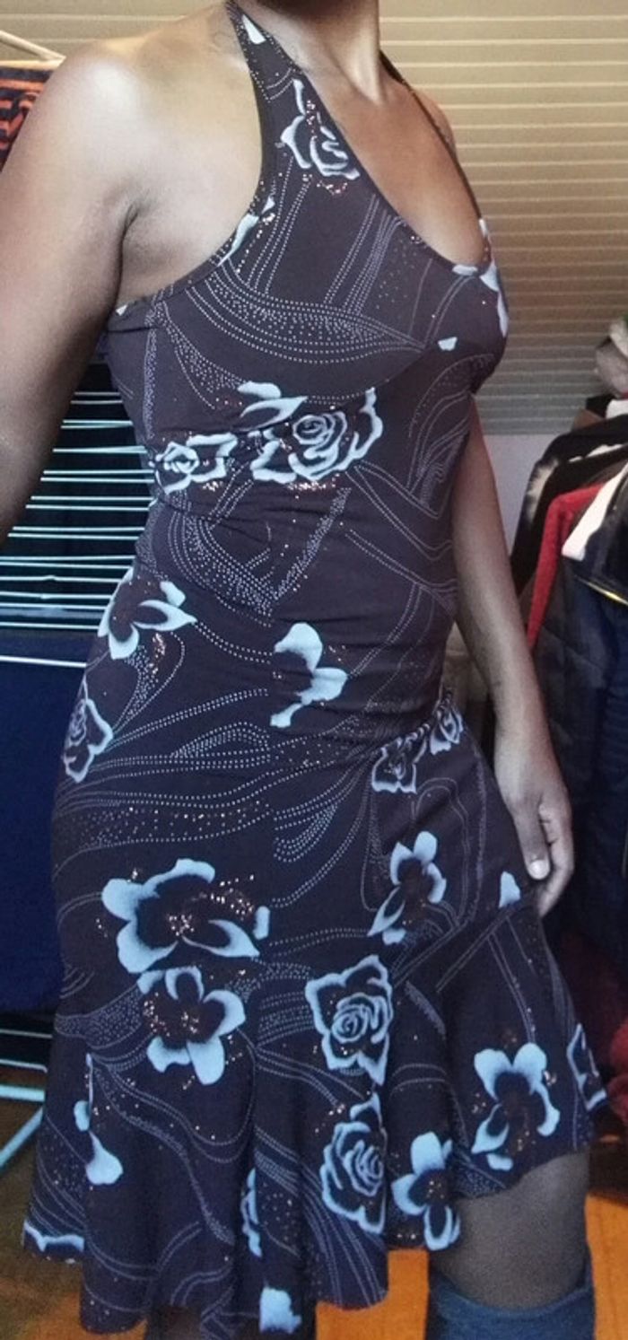Robe marron, dos nu, motifs fleurs, paillettes par endroit