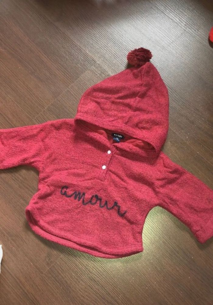 pull style poncho avec capuche et pompon taille 3 mois - 56/62 cm marque Kiabi porté mais en très bon état