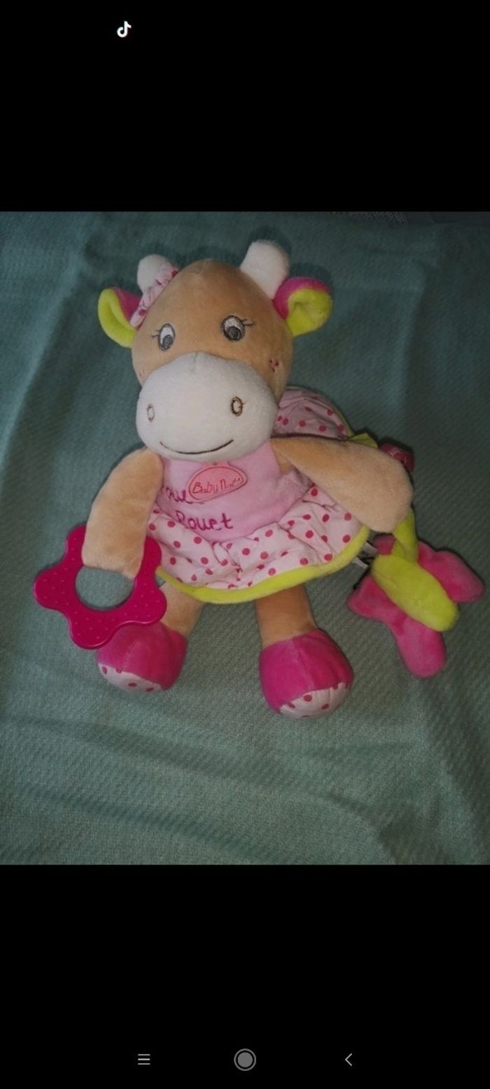 Doudou Vache coquette baby'nat Elle est en tres bon etat Rose et Verte #doudou #vache #babynat Avec anneau de dentition et papillon #pouetpouet 10 euros Envoie en relais