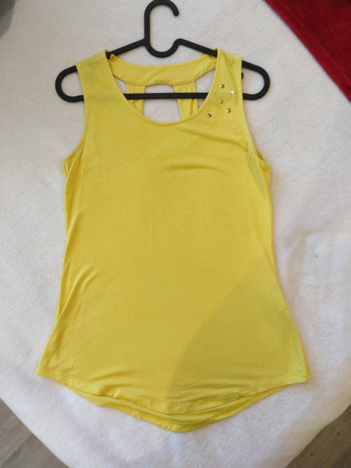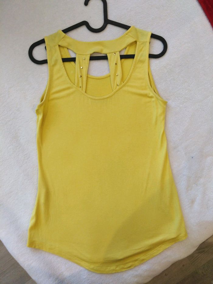 T-shirt taille S, décolleté rond, arrière original, sequin sur l'avant gauche au niveau de l'épaule. En très bon état.