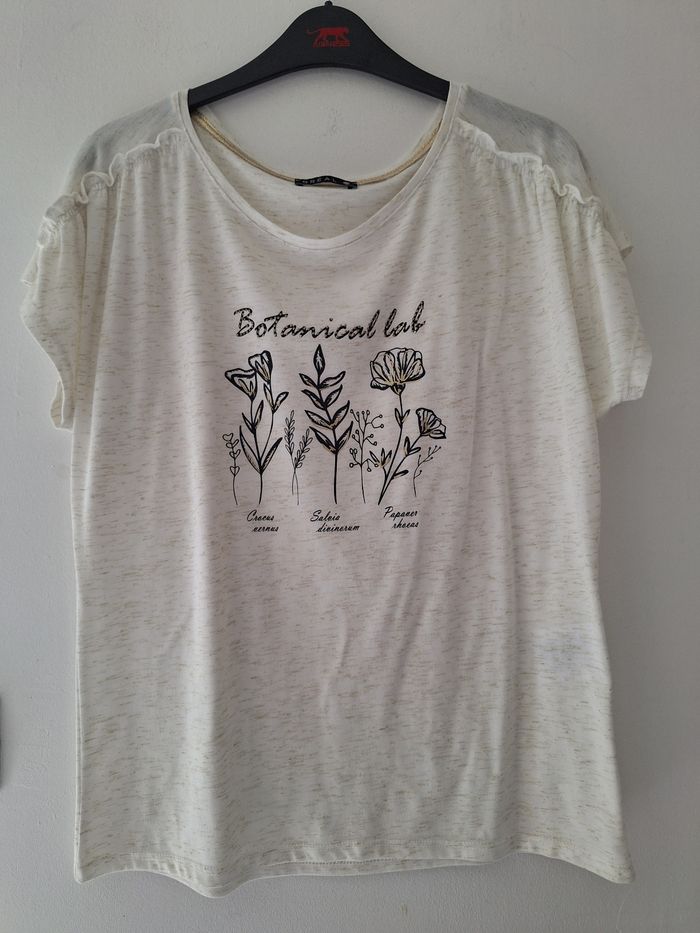 FEMME 36 / S N°1707 Tee shirt ecru Imprimé Fil doré 74% viscose 25% polyester 1% fil métallisé Taille 36 / s Patrice bréal 8€50 #kelly_femmeT36