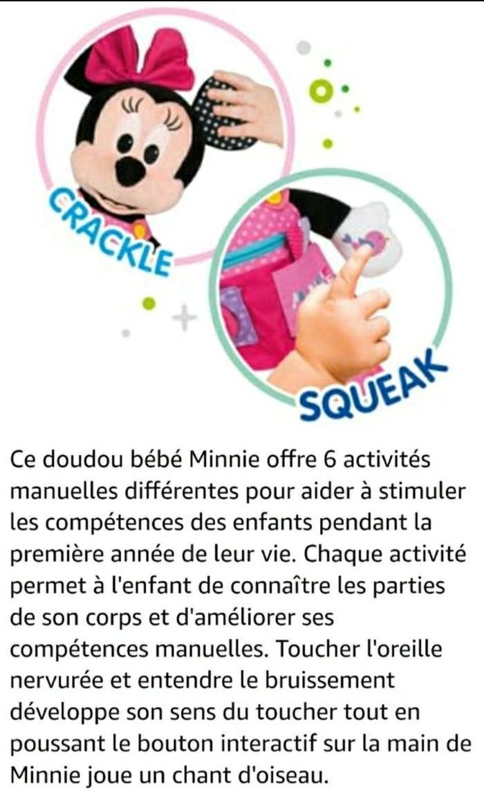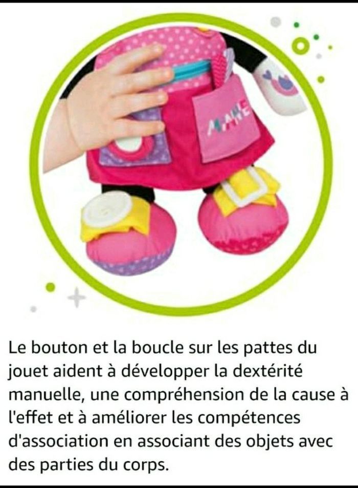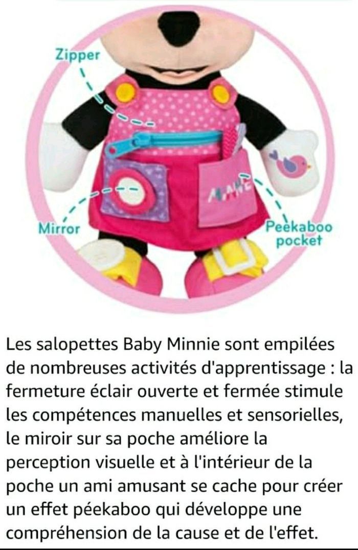 NEUF JAMAIS OUVERT Age : 12 mois Dimensions : 26.5 x 15 x 38 cm Dimensions Baby Minnie : 35 cm Une peluche Baby Minnie avec des activités manuelles pour stimuler les capacités motrices des petits Les chaussures de Baby Minnie ont des lacets pour apprendre à faire et défaire des boucles. Sa tenue dispose d'une fermeture zippée à ouvrir et à fermer, d'une poche à boutonner et déboutonner et d'une autre poche avec fermeture velcro, qui cache un compagnon à poils à qui l'enfant peut faire "Coucou" à chaque apparition. De plus, la main de Baby Minnie fait un son amusant lorsqu'elle est pressée. Cette peluche d'activités Baby Minnie aide les enfants à développer leurs capacités motrices et sensorielles et à comprendre la relation de cause à effet. Chaque activité permet à l'enfant d'apprendre et de parfaire ses sens ainsi que sa motricité.