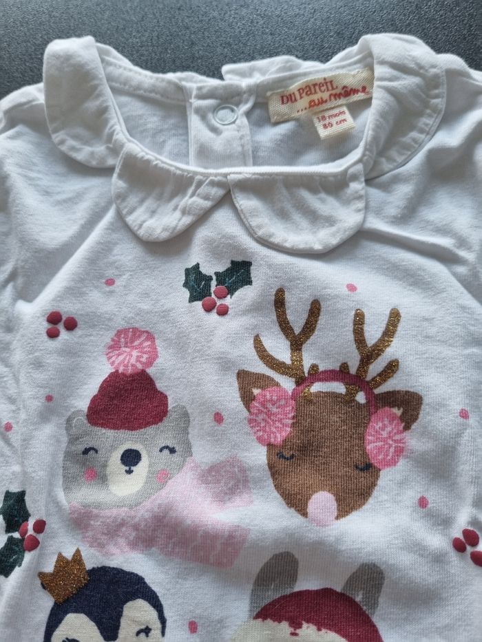 T-shirt manches longues blanc thème hivernal (mini trace sur une manche voir photo), Du pareil au même, 18 mois Très bon état Possibilité de faire un lot. N'hésitez pas si questions ou besoin d'autres photos.