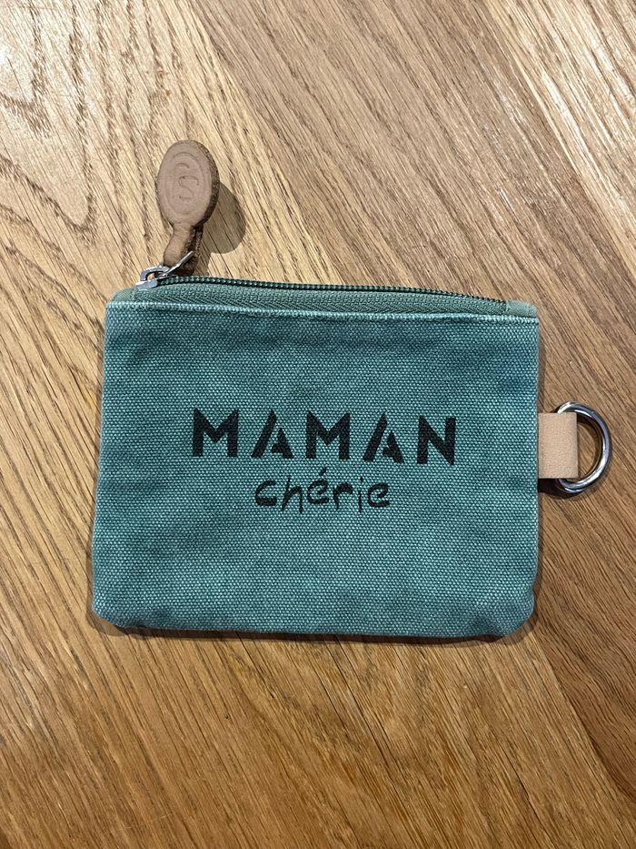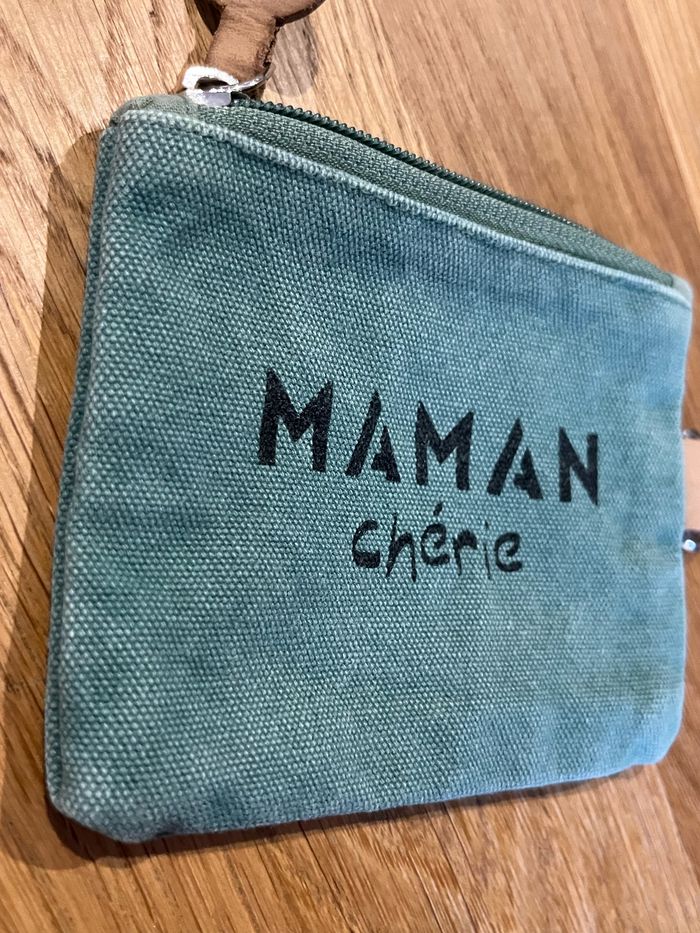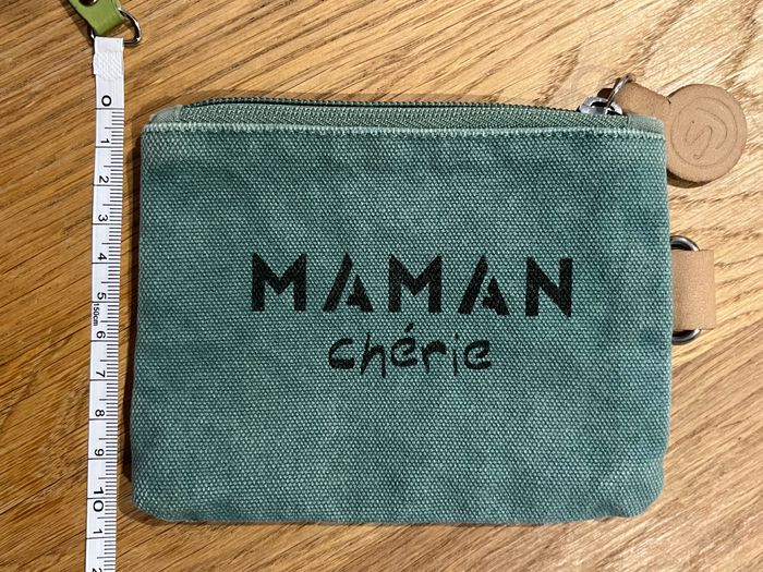 Pochette porte monnaie Maman Chérie Vert effet brossé délavé naturel d’origine  Visuel message texte noir Intérieur doublé Fermeture zip Boucle sur côté  Cf photos pour dimensions - photo numéro 1