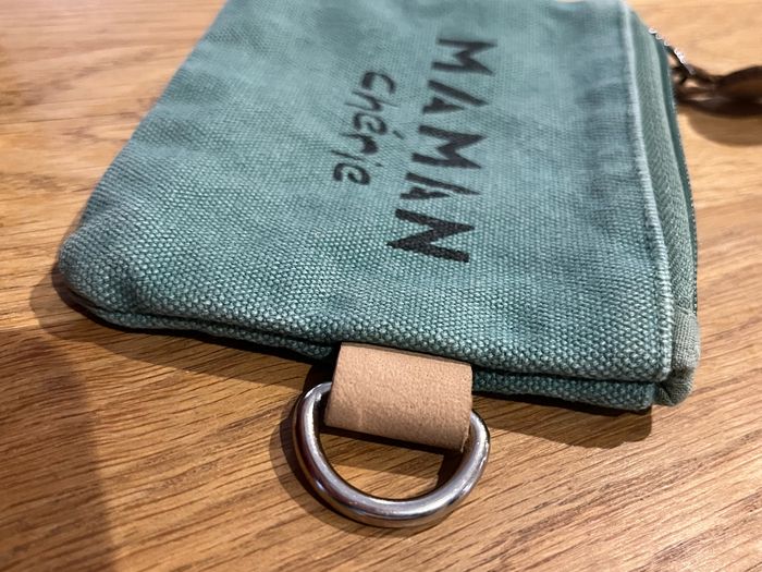 Pochette porte monnaie Maman Chérie Vert effet brossé délavé naturel d’origine  Visuel message texte noir Intérieur doublé Fermeture zip Boucle sur côté  Cf photos pour dimensions