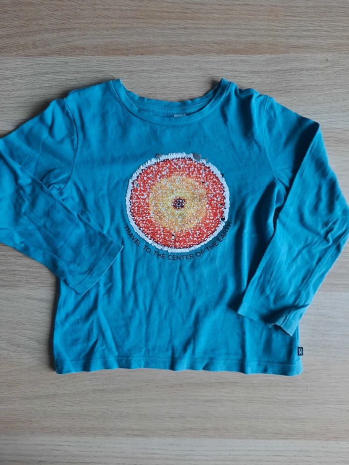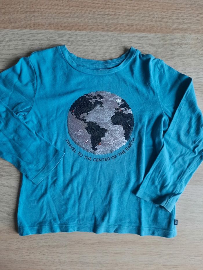 ‼️ Les motifs réversibles Tee-shirt à manches longues bleu clair, avec motifs 🌎 en très bon état. Retrouvez tous mes articles ⬇️ #catandco_3ans #catandco_hautsenfant