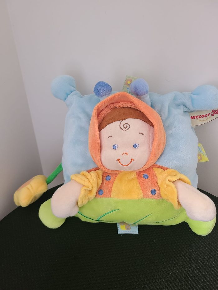 DOUDOU COUSSIN NICOTOY COCCINELLE COCCINNELLE BONHOMME PETIT GARCON FEUILLE VERTE COCCI PAPILLON ORANGE JAUNE OREILLER BLEU FLEUR ANTENNES 129