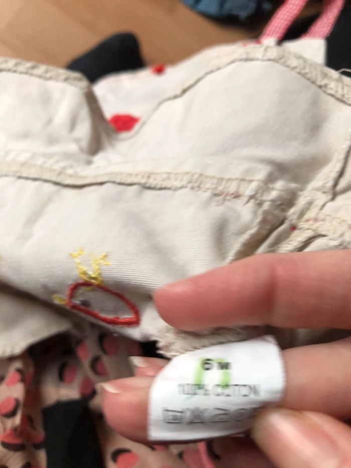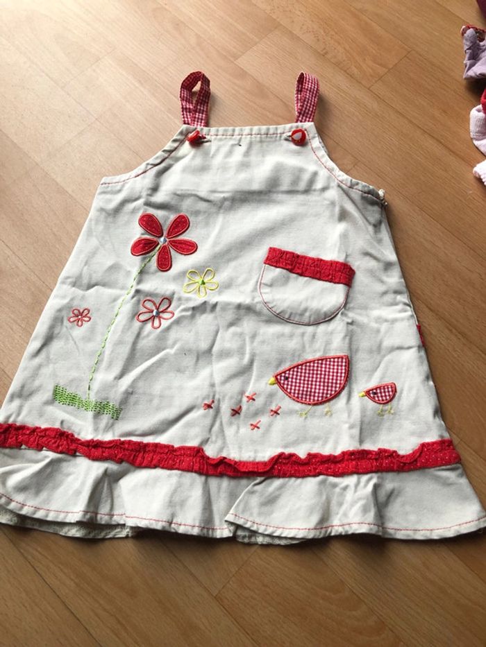 Robe à bretelles 6 mois Dessin avec poule, fleur Bon état Rouge et beige Réduction activité sur le lot