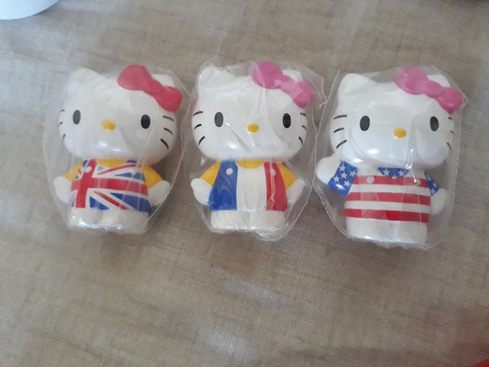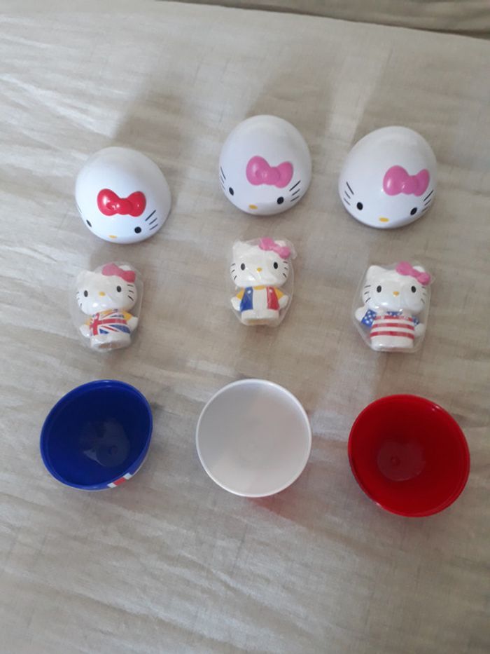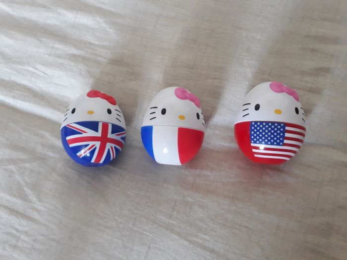 Lot de 3 oeufs avec figurines Hello Kitty Royaume-Uni, France et États-Unis 8 euros #picolo354hellokitty #picolo354figurines #picolo354jouetsenfants