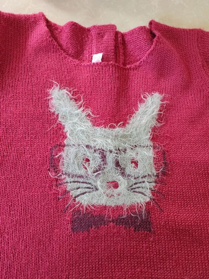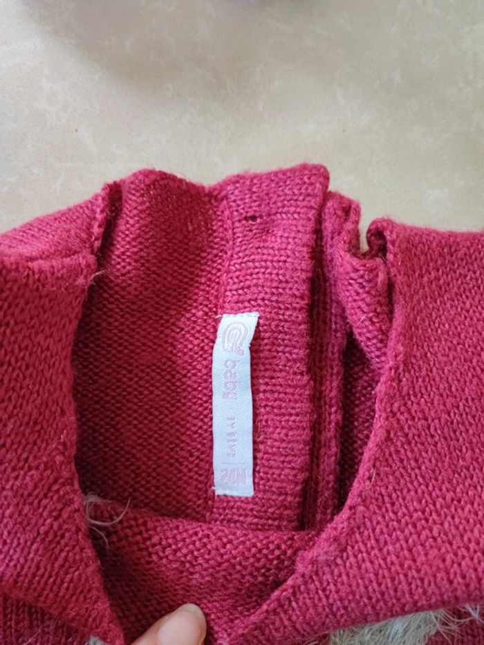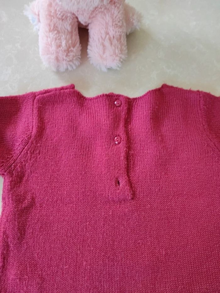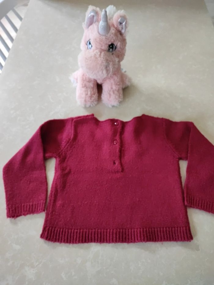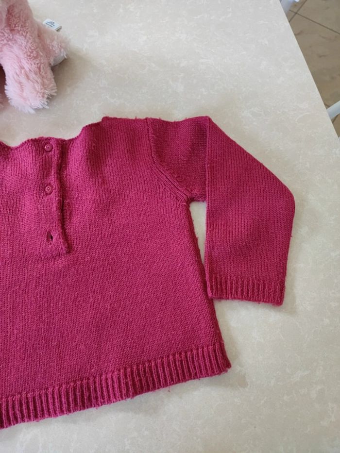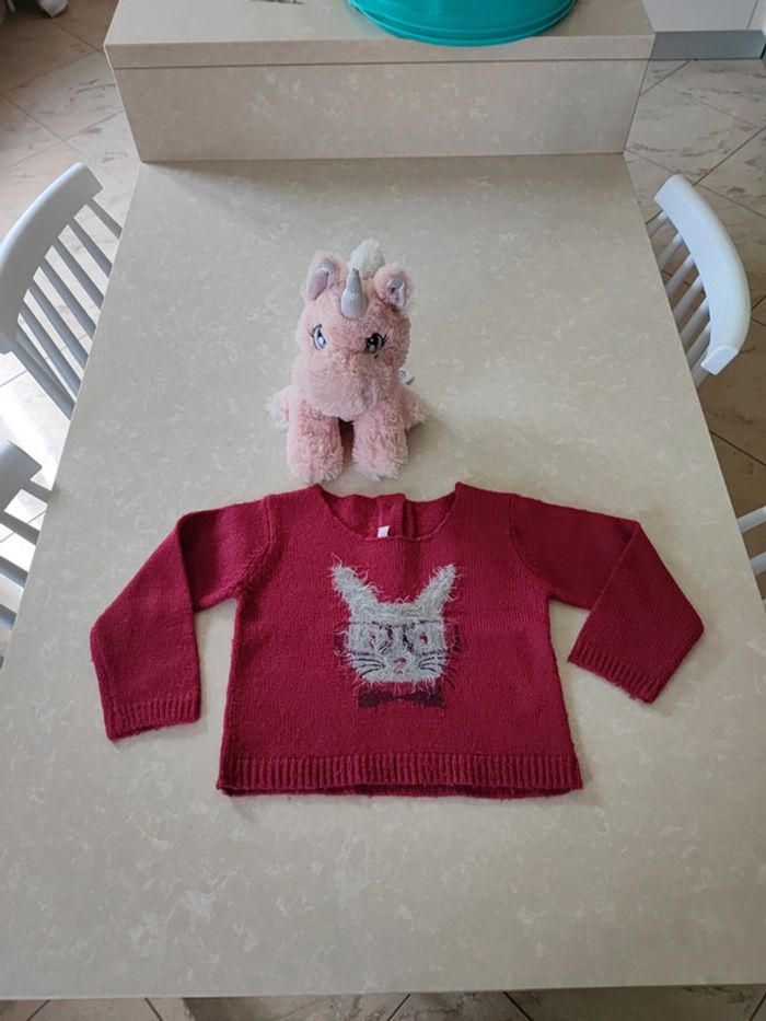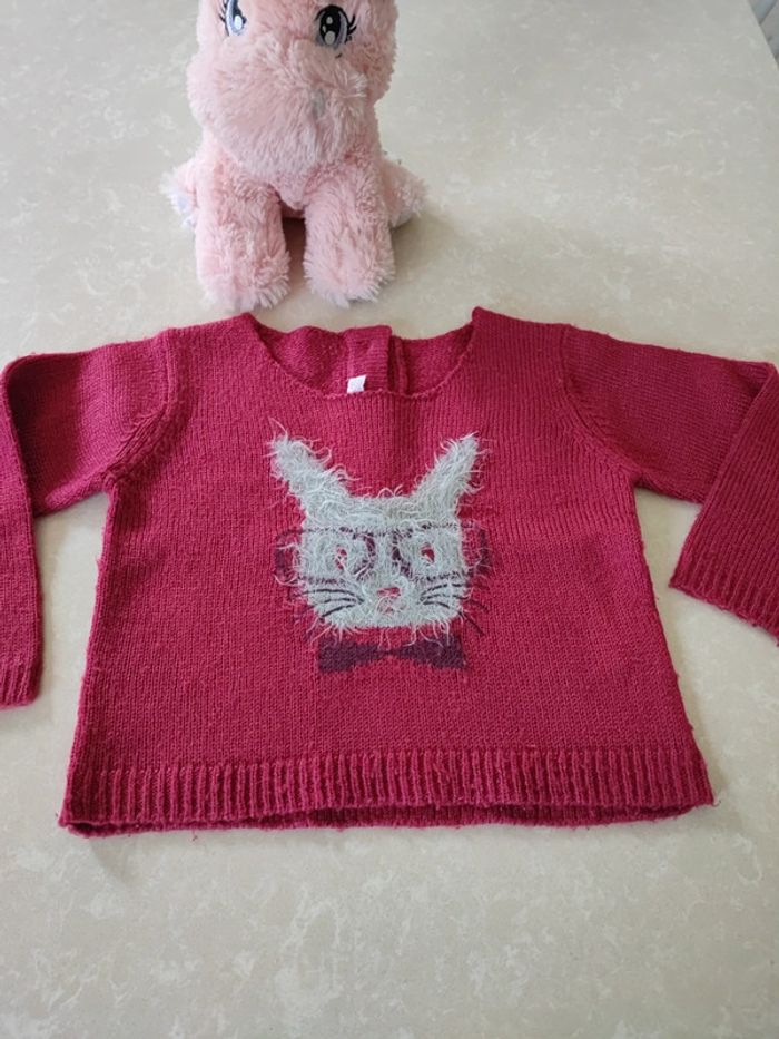 Petit pull bordeaux avec joli lapin gris frisé au centre.. Se ferme d errière avec 3 Boutons . Marque :Gémo Très bon état juste quelques mini bouloches comme sur photos.