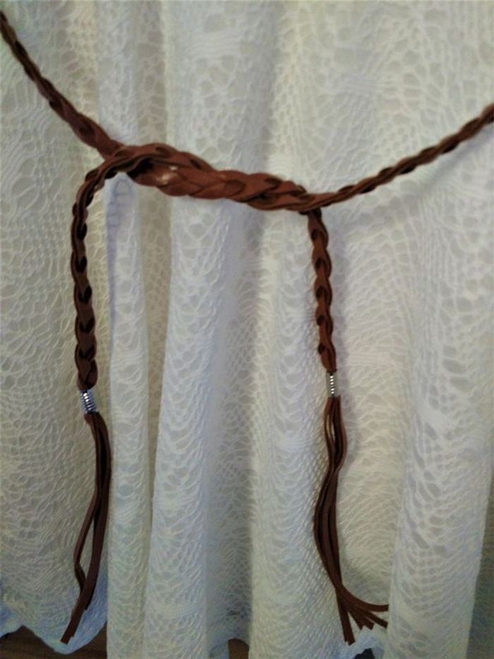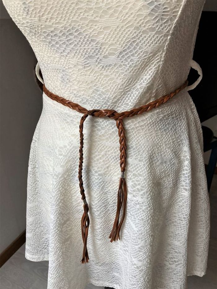 Robe de cérémonie, de soirée ou de fêtes. dos croisé, passants pour ceinture tressée imitation cuir camel. Coton doublé. Tour de poitrine 82 cm, tour de taille 72 cm, hauteur 82 cm.
