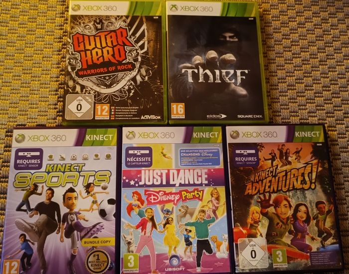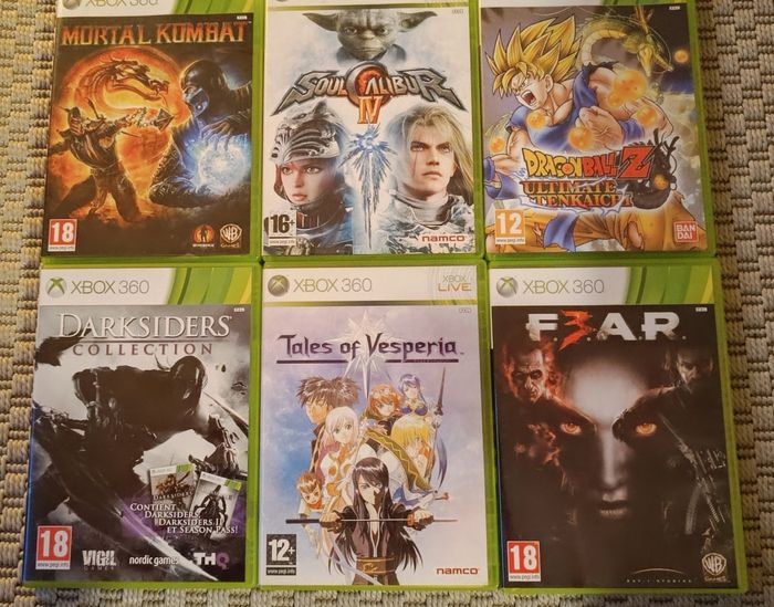 Prix fermes. Les jeux peuvent être vendus séparément. Je vends aussi ma Xbox 360 et la kinect sur demande. Soul calibur 4 : 3€ Tales of vesperia : 5€ Dark messiah : 3€ Dragon ball Z : 5€ Fear 3 : 5€ Alone in the dark : 3€ Guitar hero warriors of rock : 10€ Mortal kombat : 3€ Oblivion : 20€ Tomb raider : 5€ Minecraft : 2€ Condemned : 10€ Thief : 3€ Kinect sport : 2€ Just dance Disney : 10€ Kinect adventures : 2€