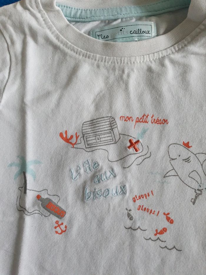 T-shirts manches courtes blancs. Marinière fine, tortue, trésor, poissons.