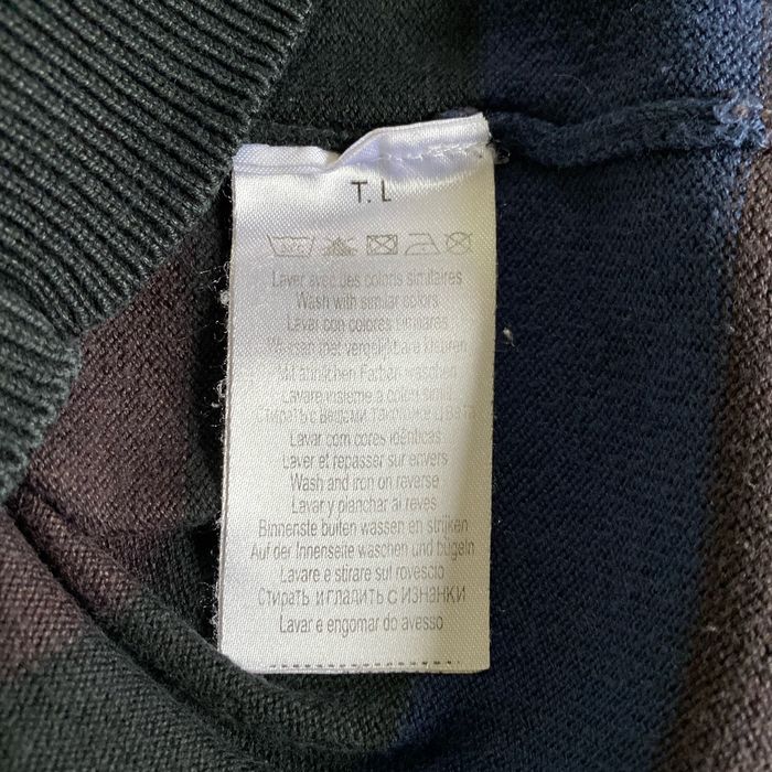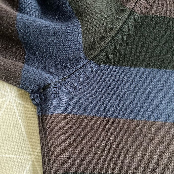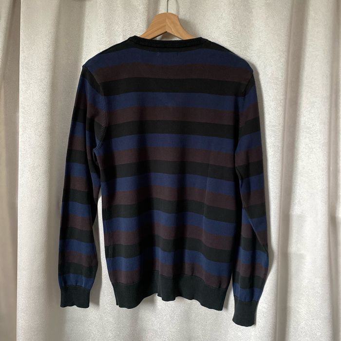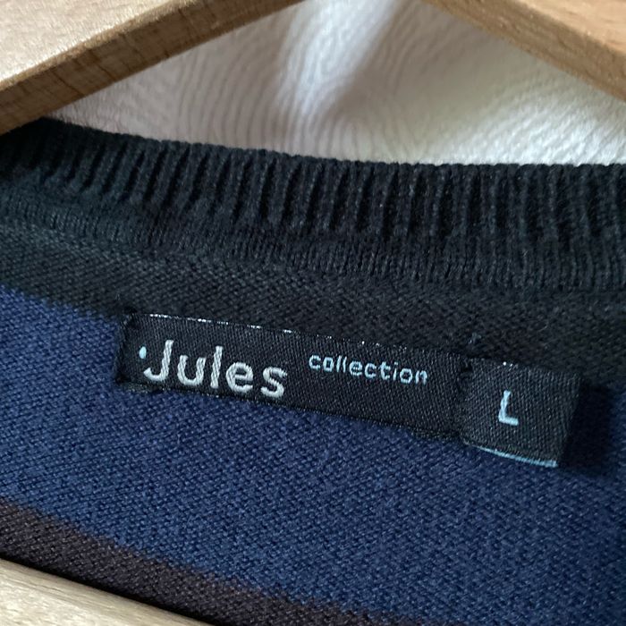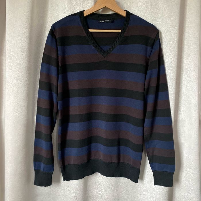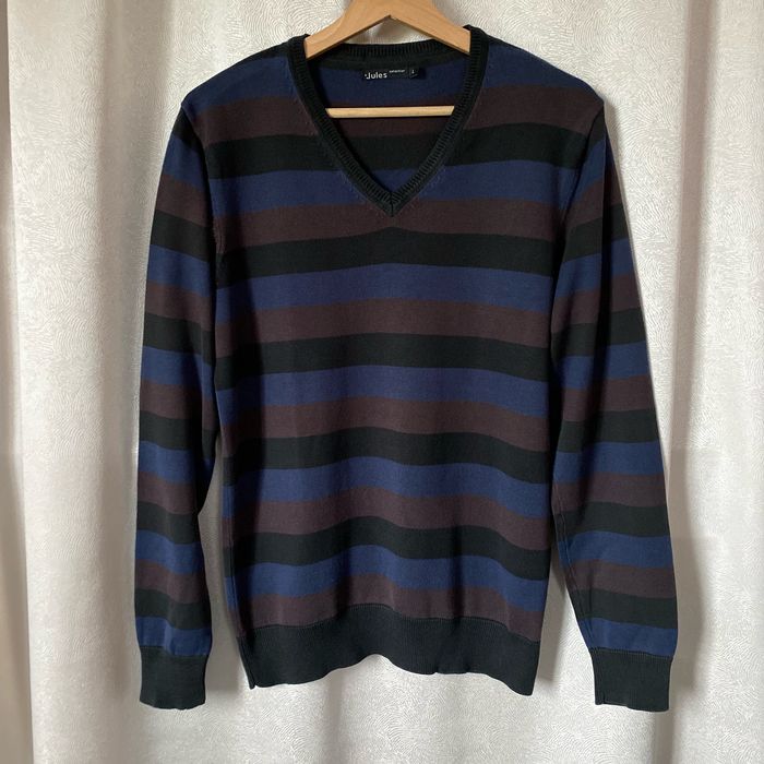 Pull homme encolure V Noir Larges rayures bleu marine et marron Petite échelle sous un bras, voir photo 50% coton 50% acrylique Taille L Jules Carrure 44 cm Aisselle à aisselle 51,5 cm Longueur 67,5 cm