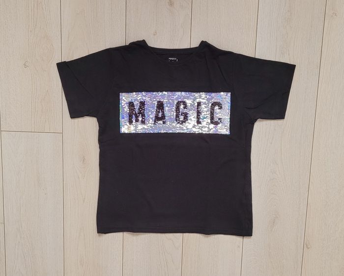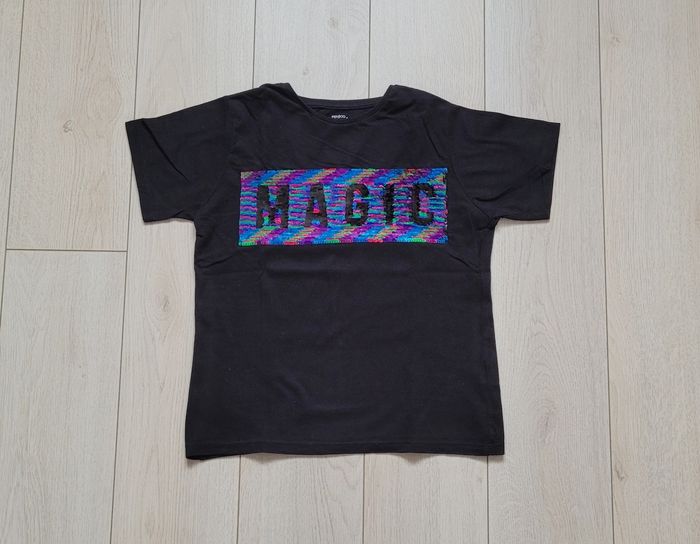 Tee-shirt, coloris noir, à paillettes réversibles argentées et multicolores, imprimé "MAGIC", taille 10 ans. ÉTAT NEUF.