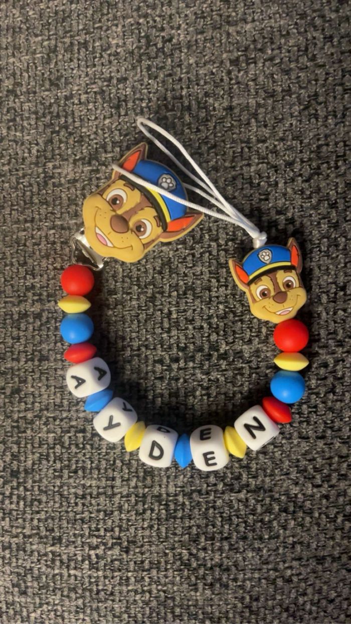 Attache tétine personnalisé en silicone ou en bois au souhait de l’acheteur . Personnalisable au choix de l’acheteur que ce soit la couleur comme le prénom ou le thème . Le fil est doublé pour plus de sécurité tout le long de l’attache tétine. N’hésitez pas à me demander et regarder mon dressing. Une photo vous sera envoyée avant l’expédition pour vous ayez un aperçu du rendu. Tous les produits sont réalisés avec du materiel spécial conçu aux bébés , enfants.