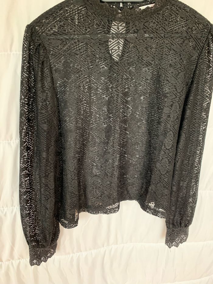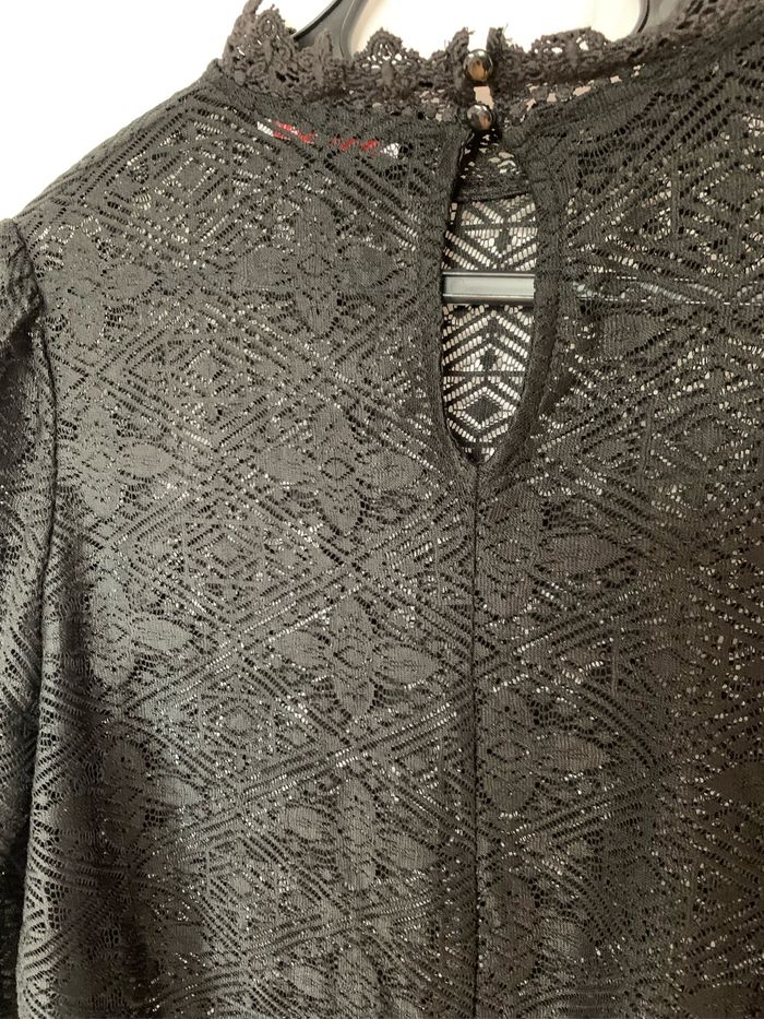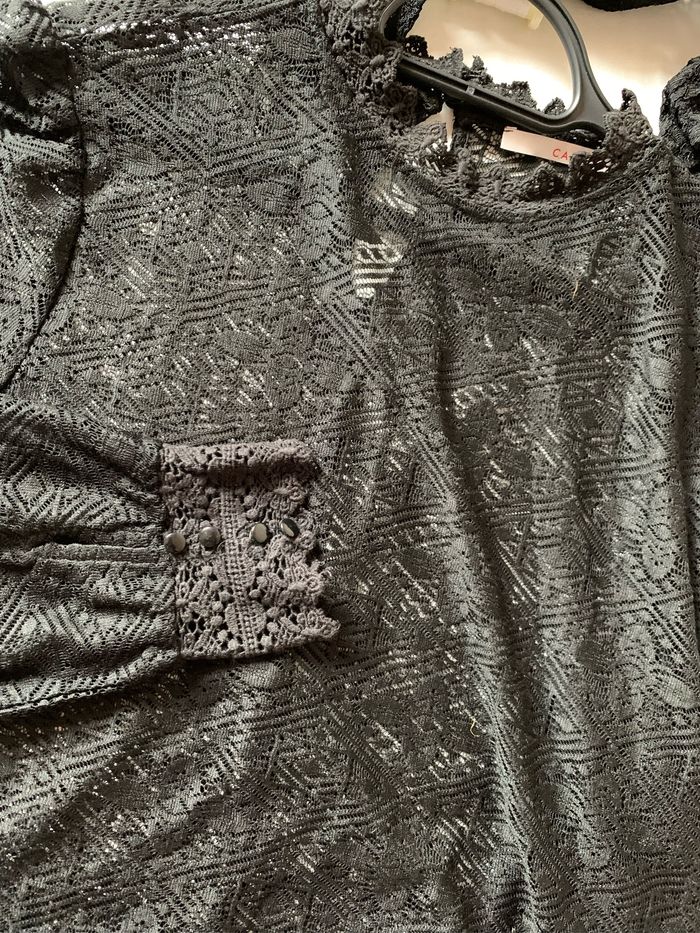 Tee-shirt en dentelle non doublée Fermetures par deux boutons au dos Manches longues fermées par trois boutons Marque camaïeu Taille 38/40 ( étiquette coupée) Les photos ne rendent pas bien la couleur mais il est bien noir. La couleur n’est pas passée En bon état