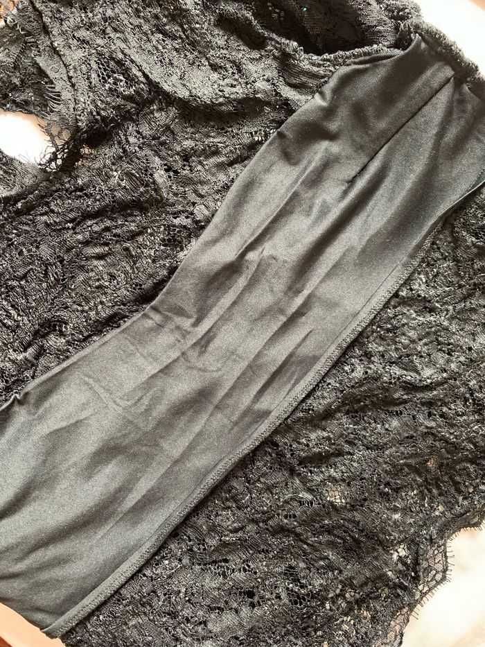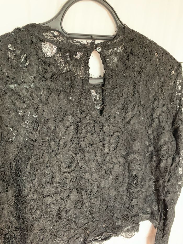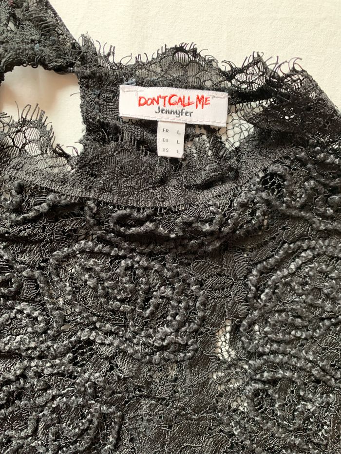 Teeshirt en dentelle Fermeture par un bouton au dos Manches longues Doublé uniquement au niveau de la poitrine devant (dernière photo montre la bande sur l’envers) Taille L. Marque Jennyfer Les photos ne rendent pas bien la couleur mais il est bien noir. La couleur n’est pas passée En bon état