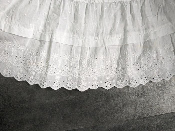 Robe blanche broderie anglaise Taille 2 ans Très bon état général mais présence de traces jaunâtres discrètes sur le dernier volant du bas (voir photo 3) Peut convenir pour une cérémonie type baptême, communion, mariage, etc... mais également être reportée ensuite dans la vie quotidienne