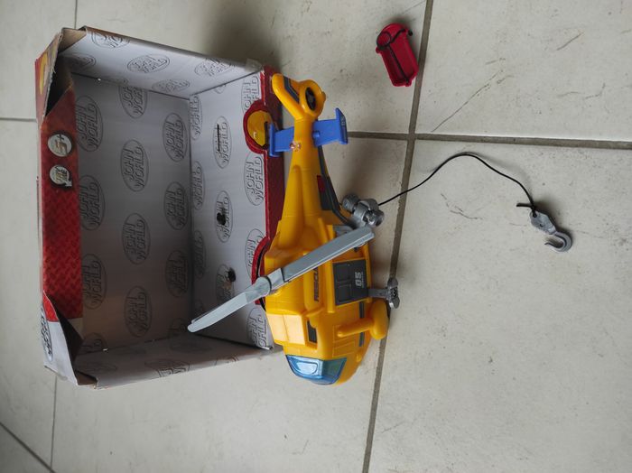 Hélicoptère en très bon état avec boîte d'achat. Mesure environ 19 cm avec son et lumière ( pile à ajouter) . Pales de l'hélicoptère tournantes. marque john world