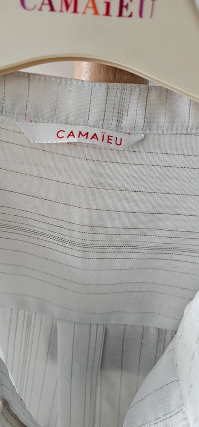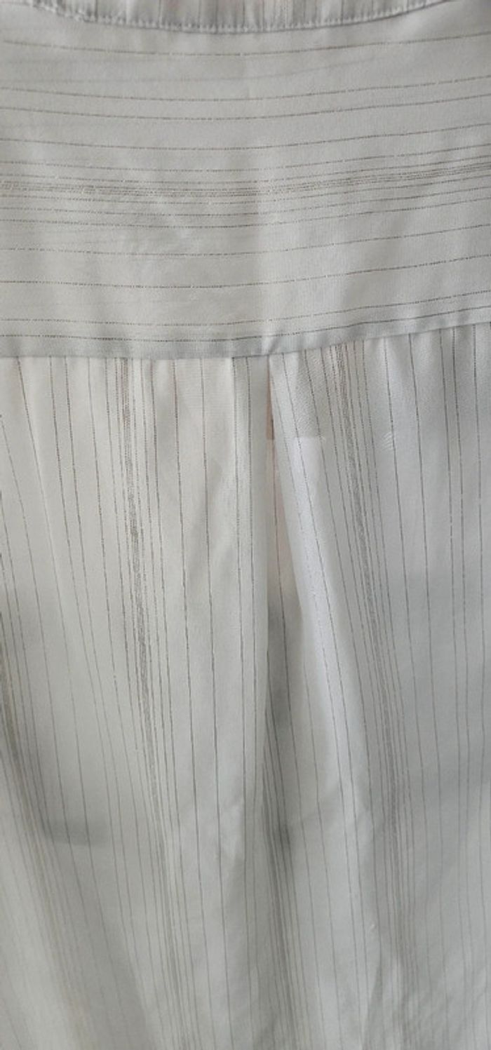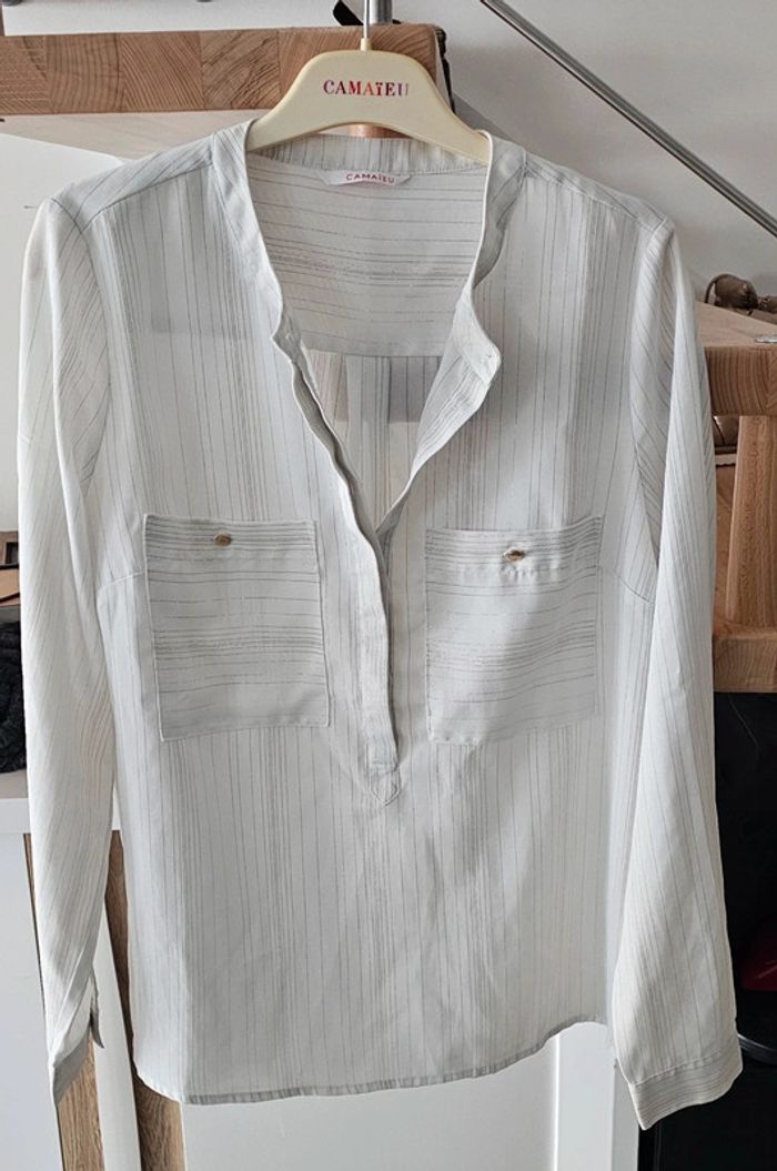 Jolie blouse camaïeu crème avec liseré or. Bouton légèrement décolorés. Voir dernière photo. En très bon état.