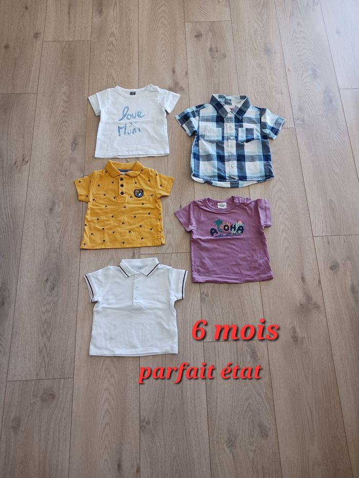 Lot t-shirts manches courtes 6 mois, parfait état, peu portés. 2 t-shirts Tape à l'Oeil (le blanc et le violet. Le violet est comme neuf). 2 polos marque inconnue 1 chemisette Tissaïa 5€ le tout