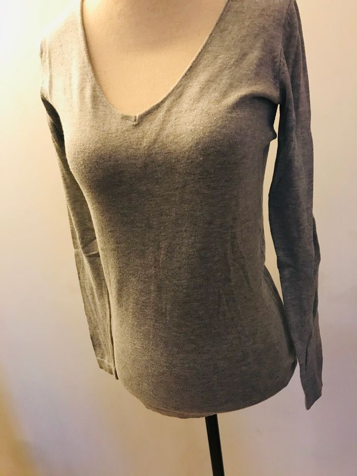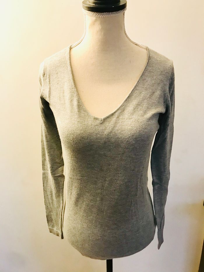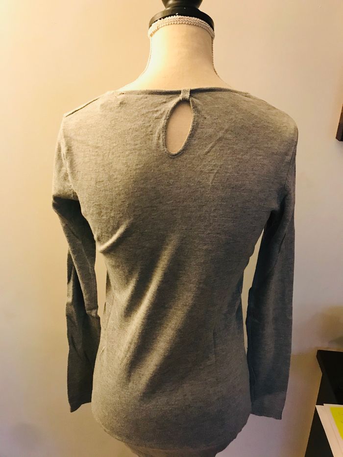 Pull femme taille XS ou fille 12/14 ans Etam Couleur gris clair Col v Effet goutte d’eau au dos avec contour pailleté argenté Très bon état (Mo)