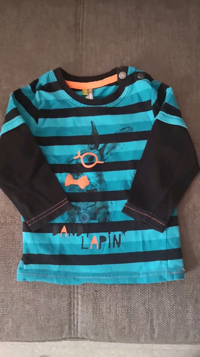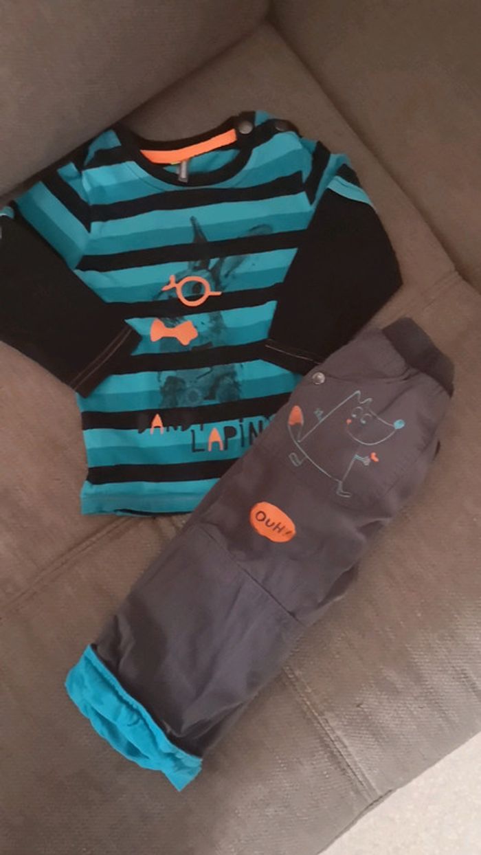 Ensemble orchestra 9 mois composé moi même pour les couleurs 😁 T shirt manches longues avec petit lapin Et pantalon avec le loup Bon état pas de tâches ni trous #bebegarcon #bebegarcon9mois #bebe9mois #orchestra #orchestragarcon