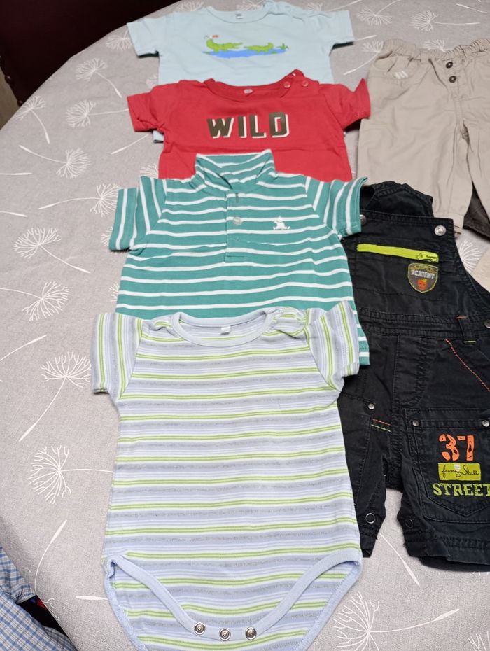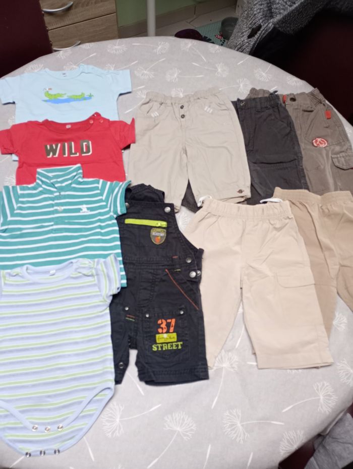 Lot de 10 vêtements en taille 68. 1 body manches courtes 1 polo manches courtes 2 t-shirts manches courtes 1 salopette 5 pantalons fins Marque P'tit Filou, Orchestra, Zeeman... Très bon état. Bac 25