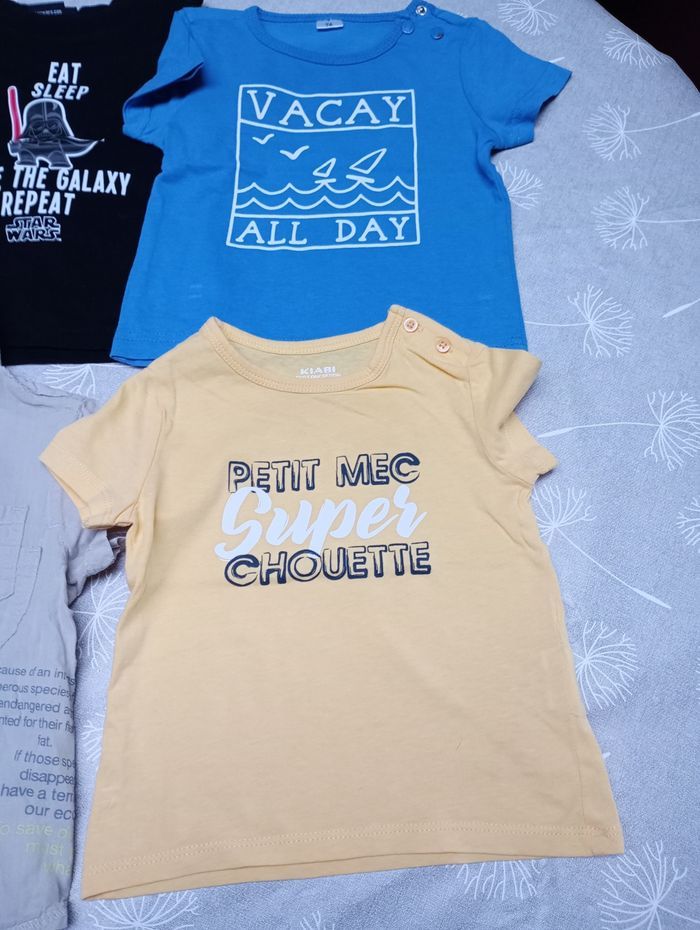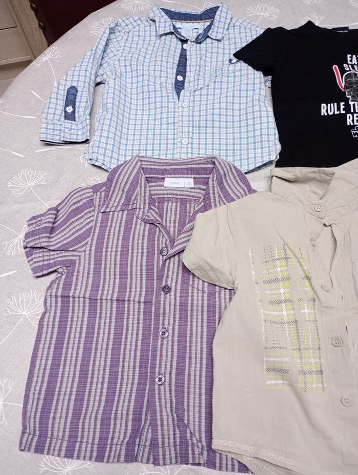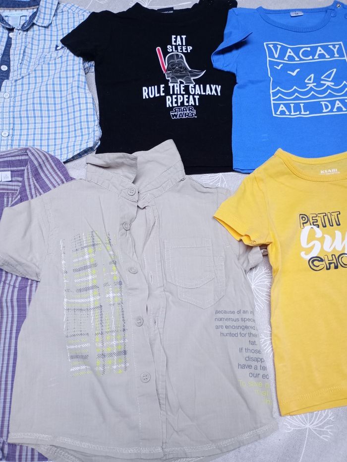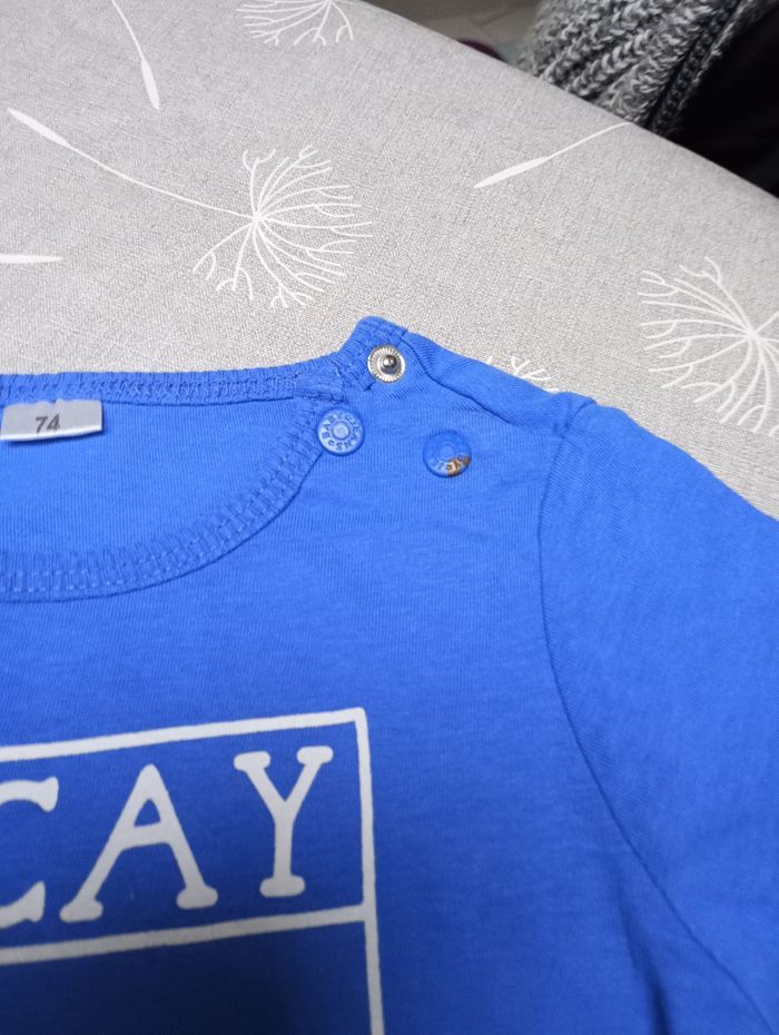 Lot de 6 hauts en taille 74-12 mois. Marque : Kiabi, Kitchoun, Mexx... 3 t-shirts manches courtes 2 chemises manches courtes 1 chemise fine manches longues Tous en très bon état mais décoloration sur une pression du t-shirt bleu (voir photo). Bac 25