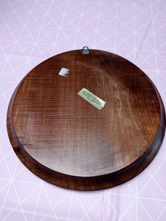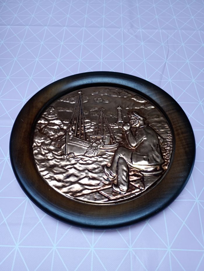Plaque décorative en bois avec insert en cuivre. Représente un pêcheur regardant un bateau. Diamètre : 24 cm. Très bon état.
