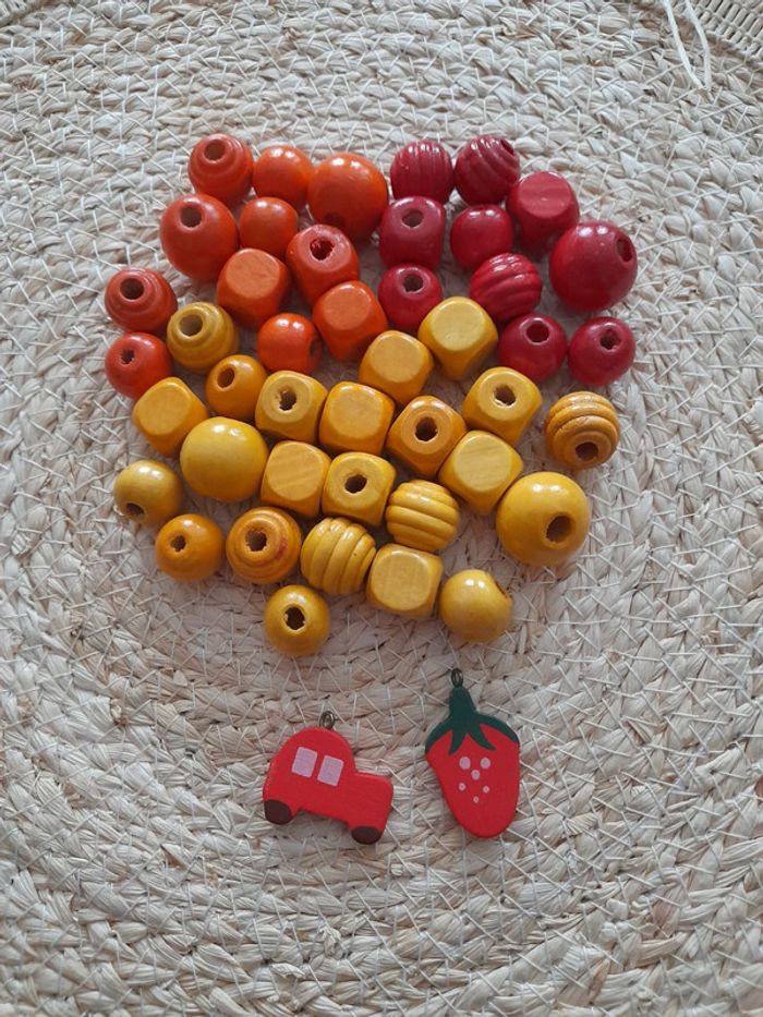 Reste de perles en bois rouge,orange,jaune Et 2 breloques en bois Très bon état #rachel62500jouetspeluchesjeux
