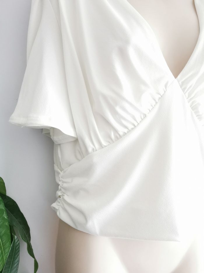 🙎‍♀️ ÉTAT DE L'ARTICLE: 10/10 ✅️ Avec étiquette🔖, jamais porté Crop top froncé 👩 H&M Taille L • Matière: 95% polyester - 5% elasthanne • Partiellement doublé ⚪ pour éviter la transparence • Coupe courte • Décolleté en V plongeant • Manches courtes papillons 🦋 • Froncé aux épaules, à la taille et sous la poitrine pour un effet drapé • Couleur: Blanc ⚪️ • 📏 Mesure épaules: 40 cm • 📏 Mesure sous aisselles: 46 cm • 📏 Longueur: 51 cm 💰 Prix boutique: 19.99€ Parfait état👌, avec étiquette🏷️jamais porté 🌹