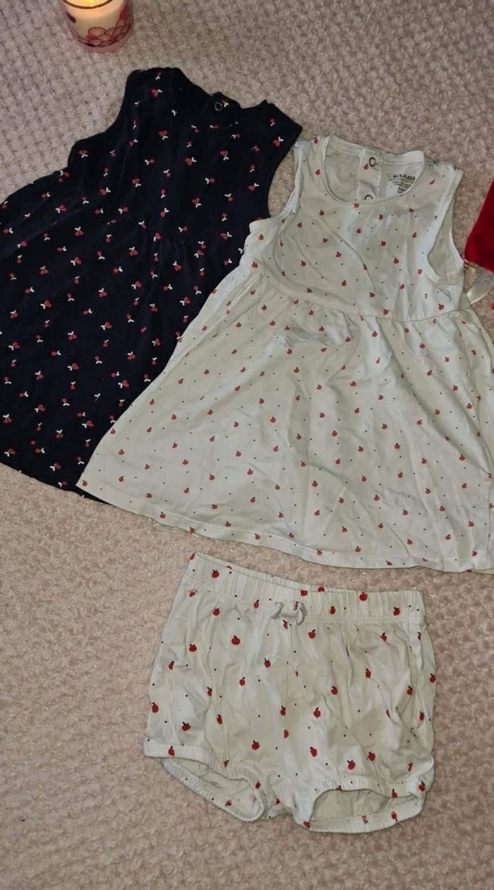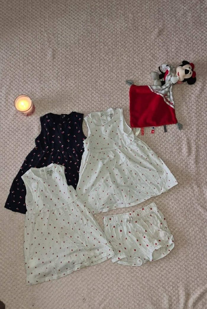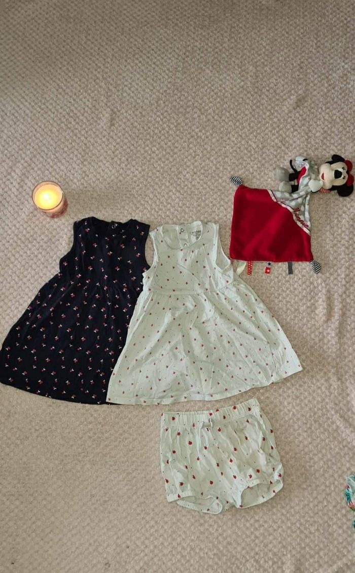 Lot de 3 robes (1 bleu marine et 2 blanches dont une qui est tachée, voir les photos) avec un bloomer (culotte) qui va avec les robes blanches, de chez Kiabi en taille 18 mois. ✅ Envois rapides 🤑 Petits prix