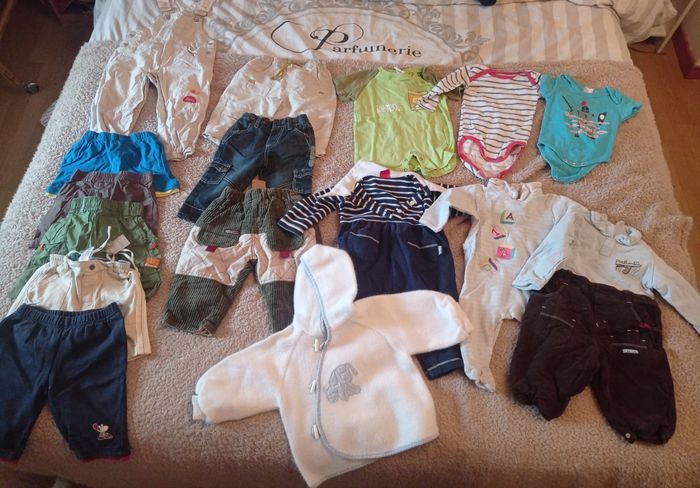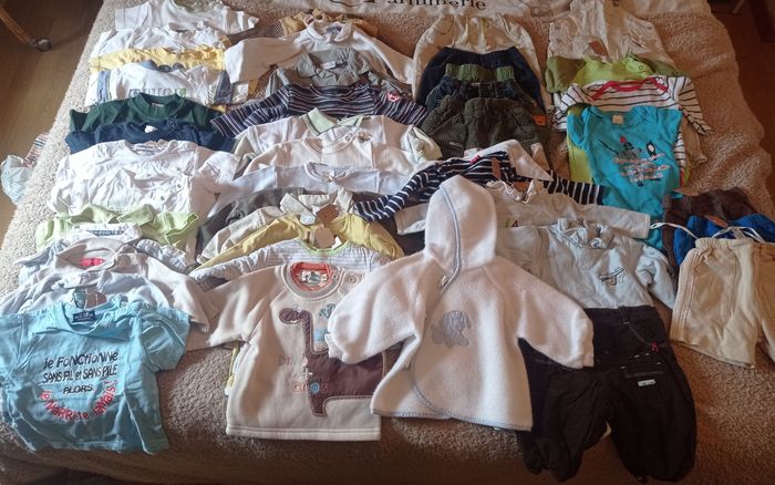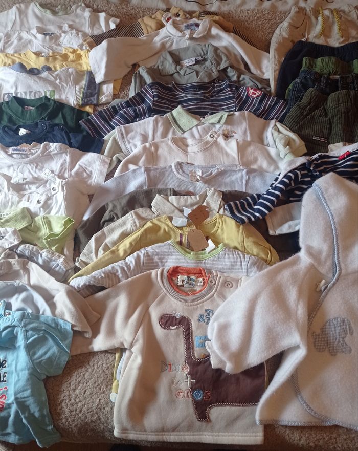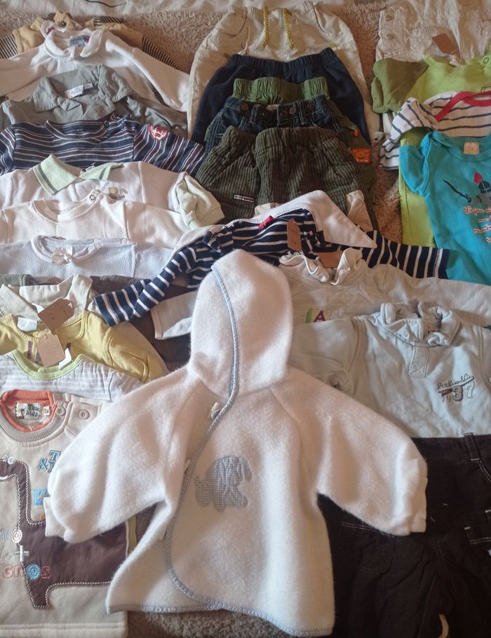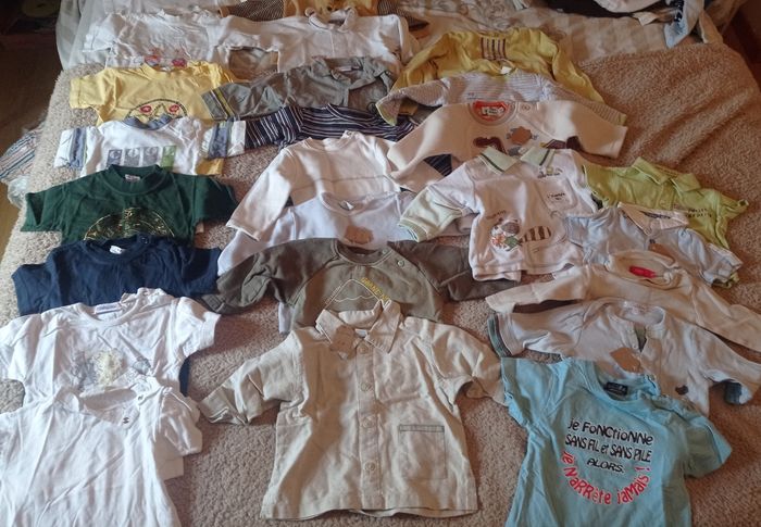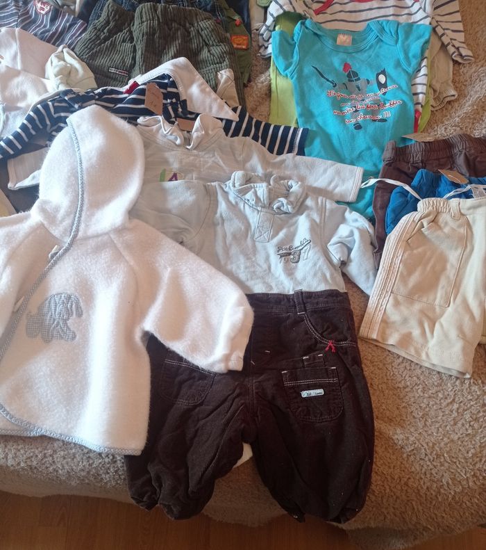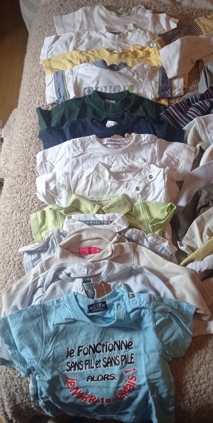 Gros lots de vêtements 6 mois En très bon état Comprenant : Tee-shirt manche courte : 11 Tee-shirt manche longue : 3 Chemises manche longue : 3 Sweat/pull : 4 Short/bermudas : 5 Salopette légère : 1 Pantalon : 3 Body : 3 Pyjama : 3 Gilet léger (Sucre d'orge) : 1 Soit un lot de 37 vêtements printemps/été