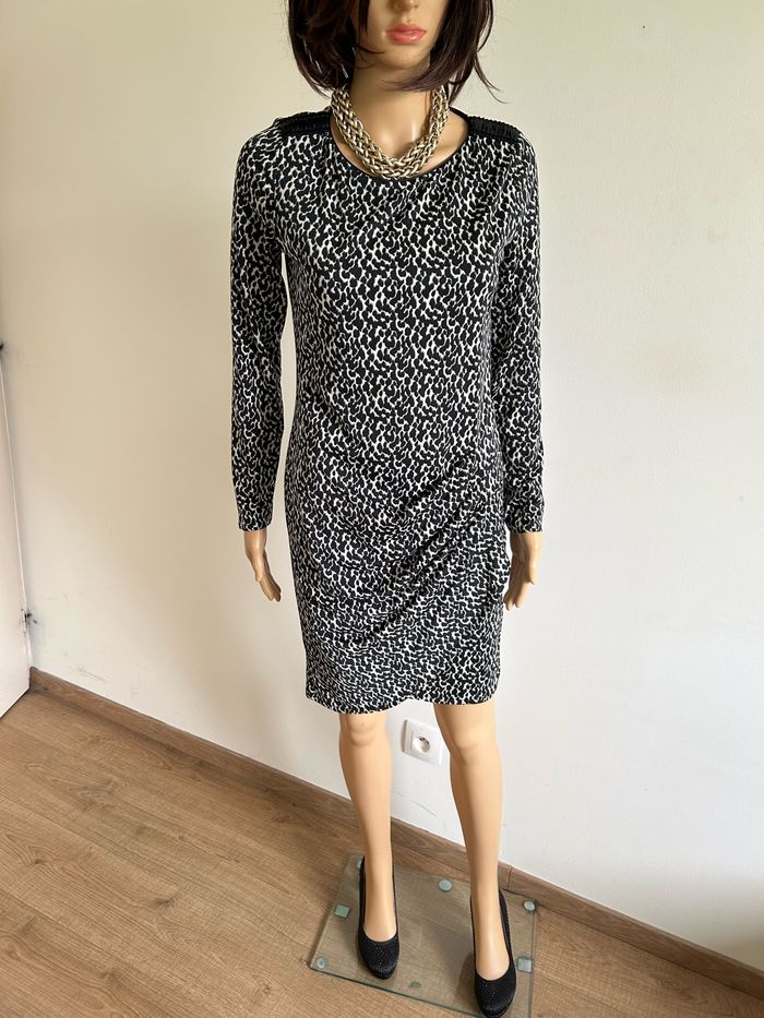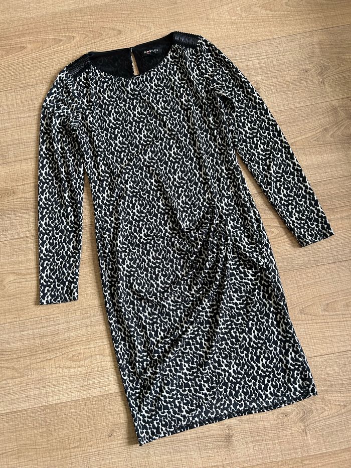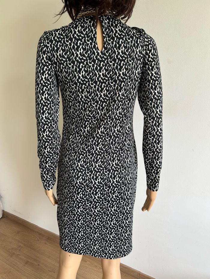 Jolie robe imprimée noire et blanche à manches longues, de marque Morgan. Taille XS qui peut convenir pour un petit S. Portée une fois, en très bon état. aisselle à aisselle 43 cms et plus épaule à épaule 37 cms et plus longueur manches 59 cms taille 38 cms et plus longueur dépose épaule 92 cms Le tissu est extensible Étiquette intérieure de composition coupée