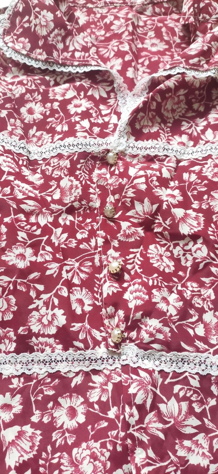 Je mets en vente cette sublime blouse tunique vintage, années 80 car ma maman la portait dans sa jeunesse, elle est faite à la main. Rouge et blanche avec dentelles et fleurs blanches. Epaule à épaule 36cm, aisselles à aisselles 42cm, taille 34cm, hauteur 50cm. (Petit trou montré en photo sur 2cm, peu visible, facile à recoudre)