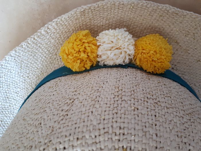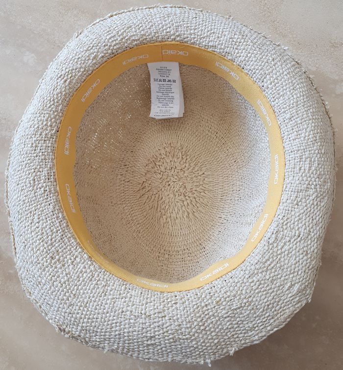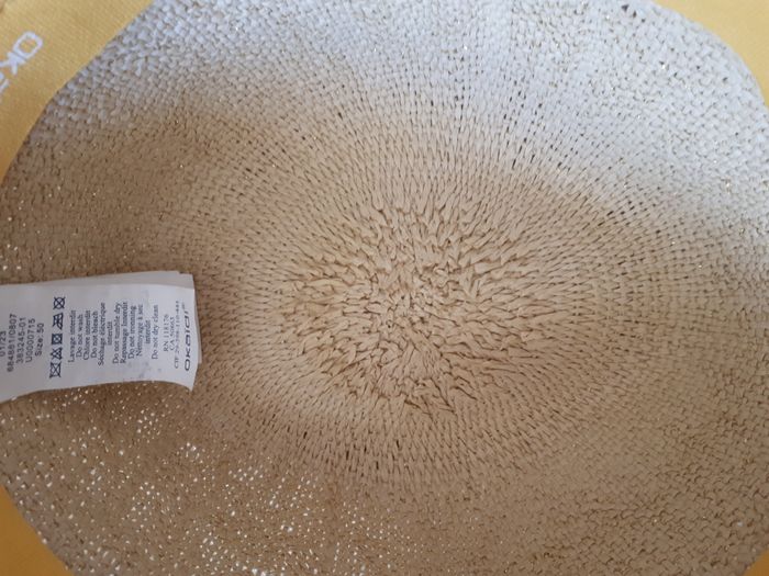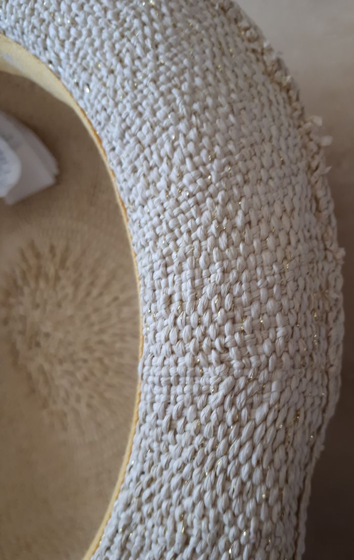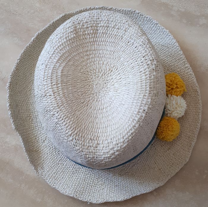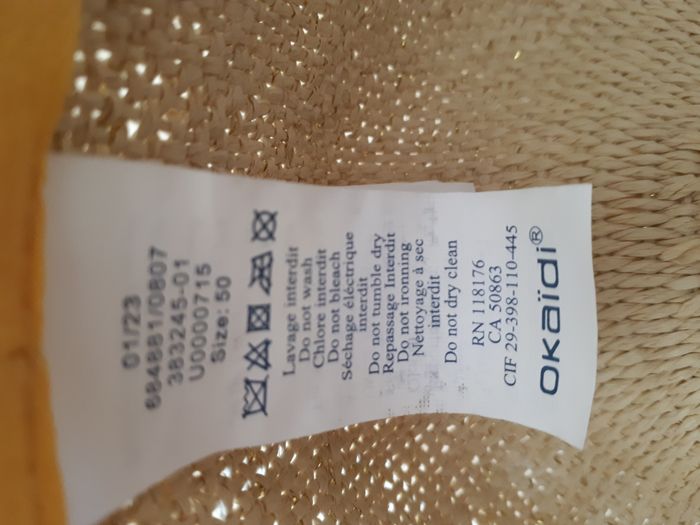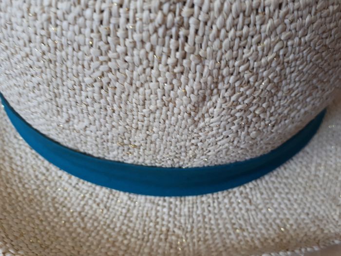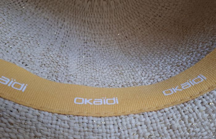 Vends chapeau bébé fille, larges bords, galon fleuri et fil métallisé argenté pour une subtile touche romantique, il protège des rayons du soleil. Tissu extérieur : 98% papier, 1% polyester et 1% fibre métallique. Largeur des bords : 5 cm. Taille : 50. Age : 2-3 ans. Marque : Okaïdi.