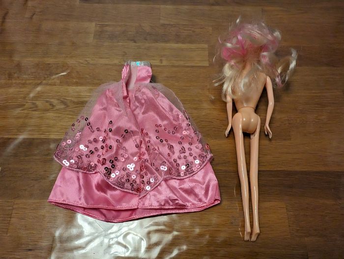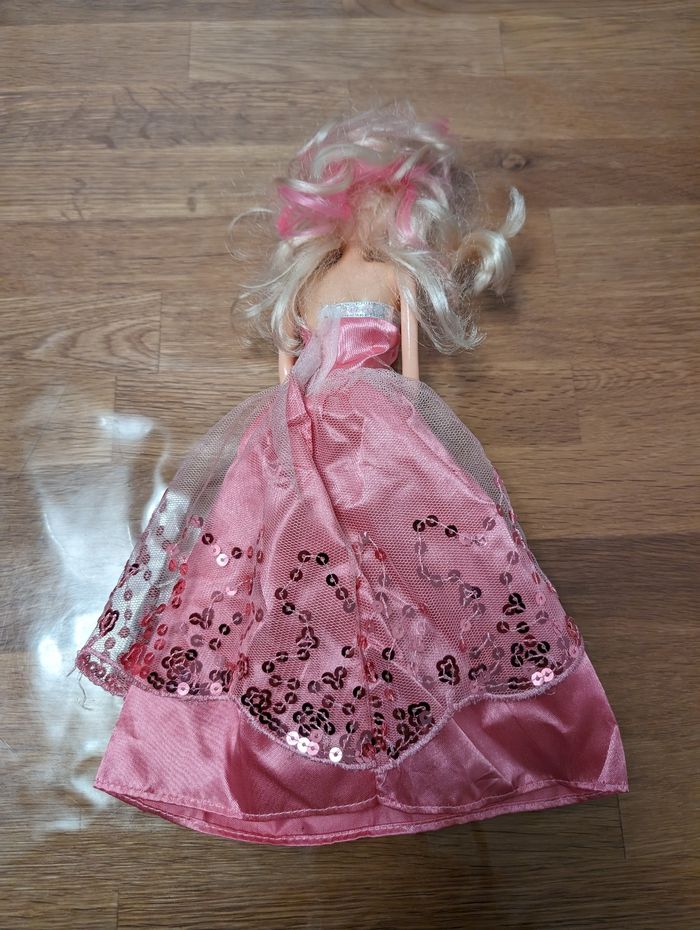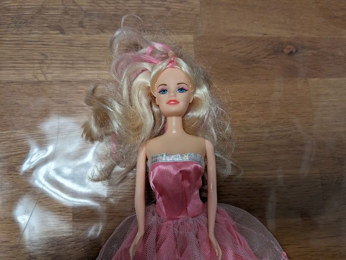 Poupée 30 cm avec sa robe rose Très bon état, une petite trace sur le menton, une mèche rose, les cheveux sont emmêlés.
