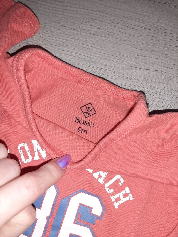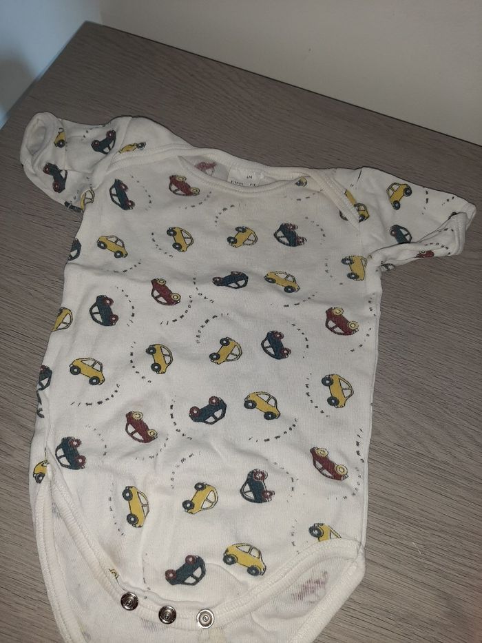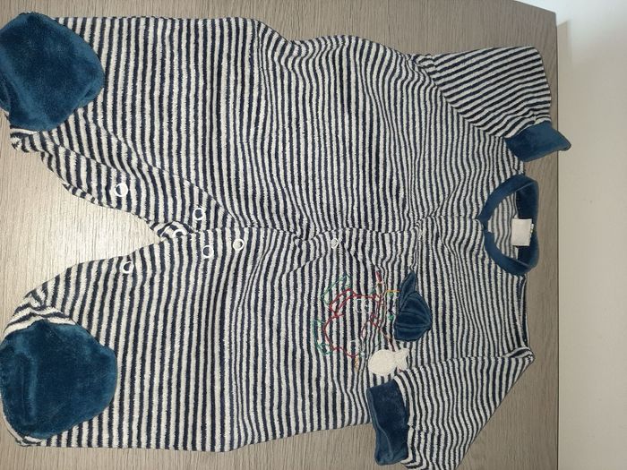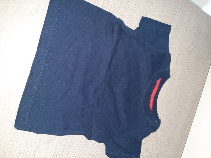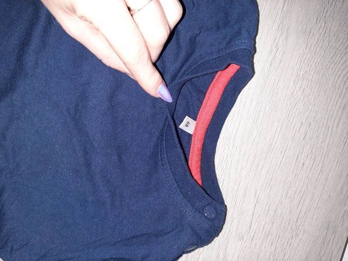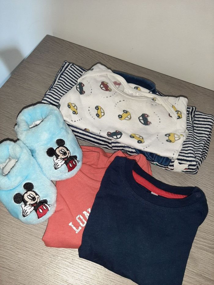 Lot garçon un pyjamas taille sûrement 6 mois car n'a plus d'étiquette Deux t-shirts un taille 62 et un 9 mois Un body taille 6 mois Une paire de chaussons neuf