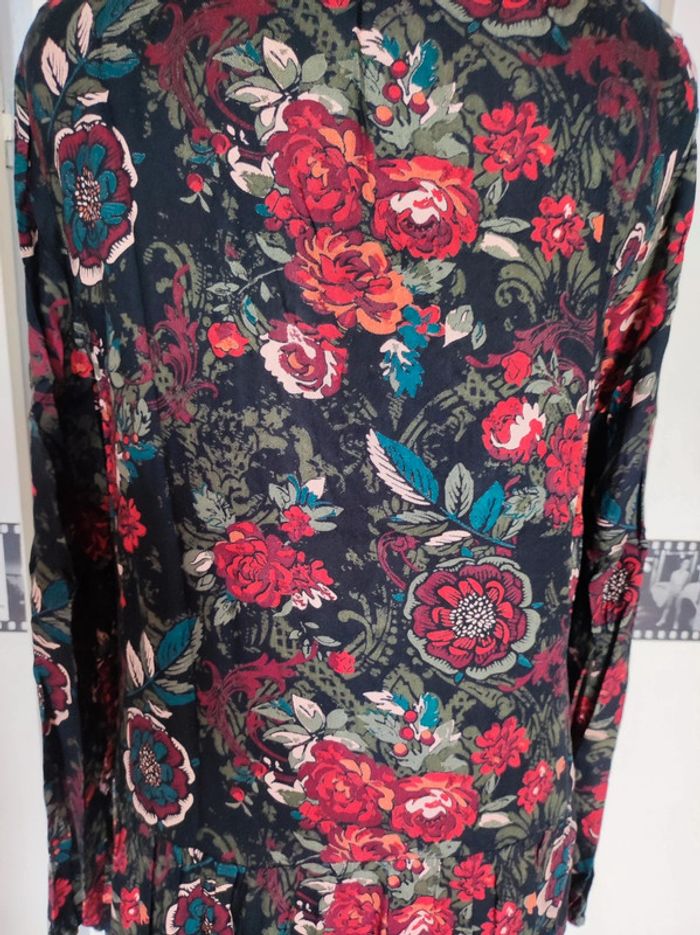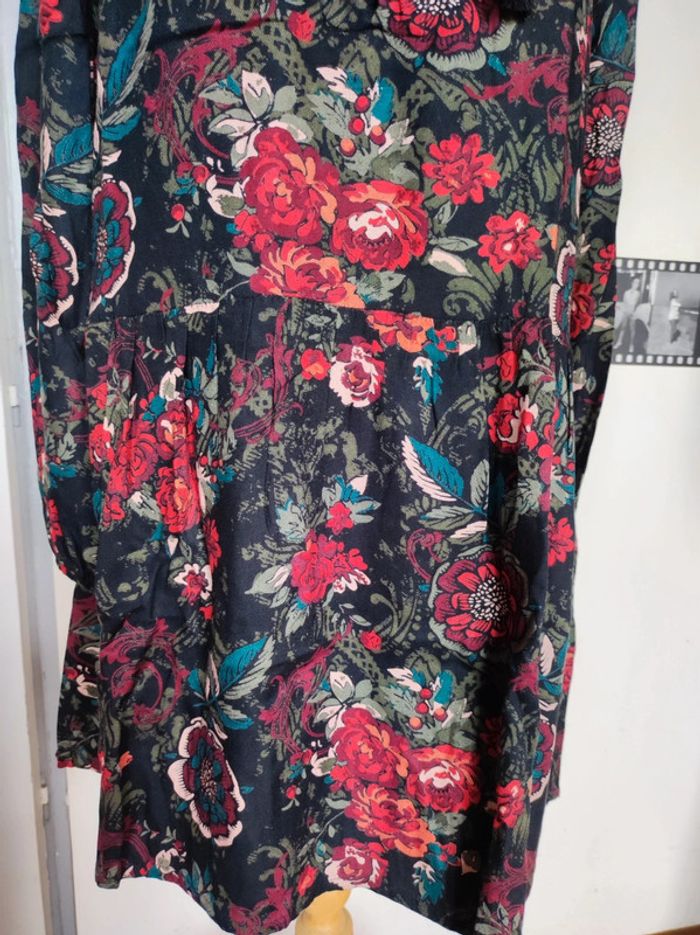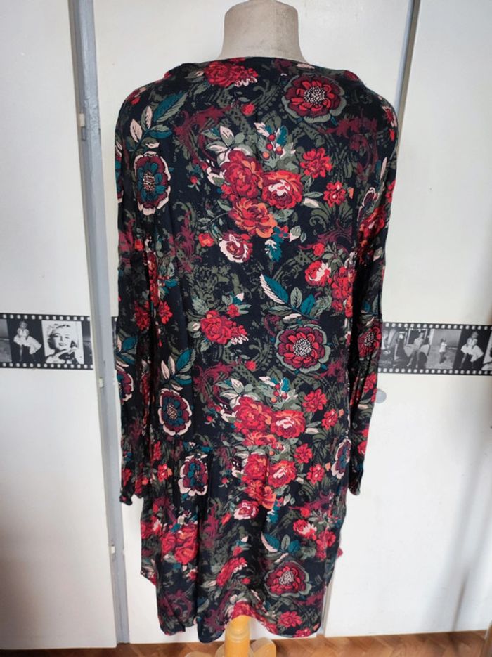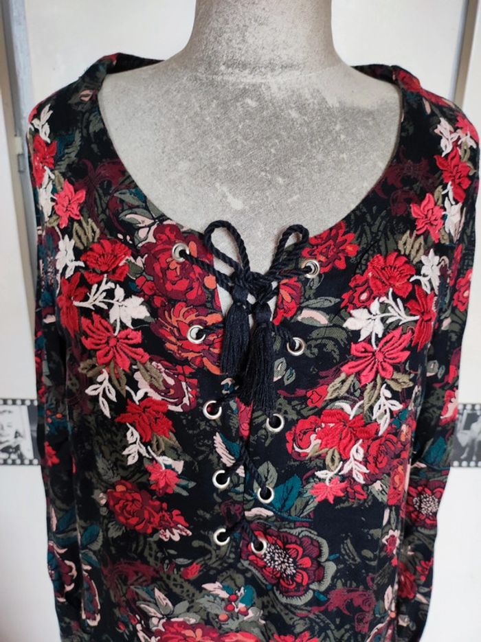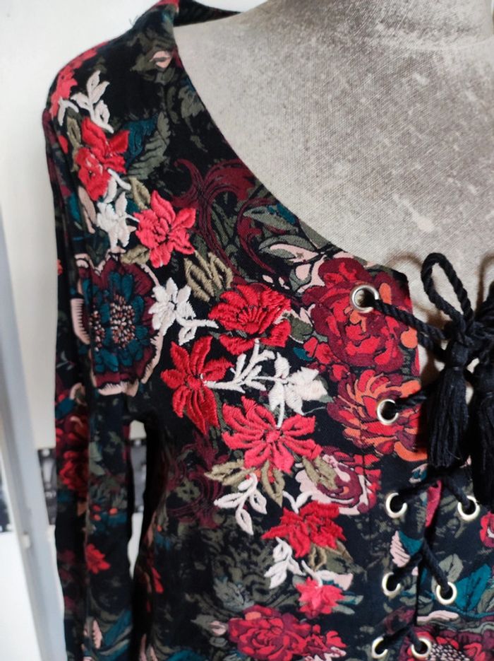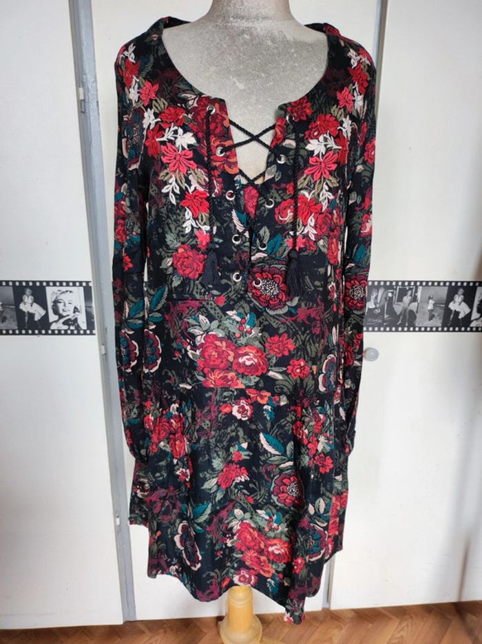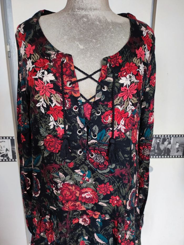 Robe Miss liberto. Taille 40. Motifs fleuris sur fond noir. #fleurs #roses #noir #rouge #vert #laçage #poitrine #mvasseur74430Femme