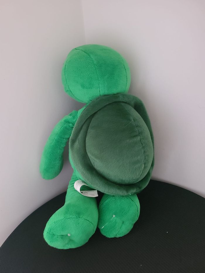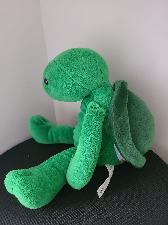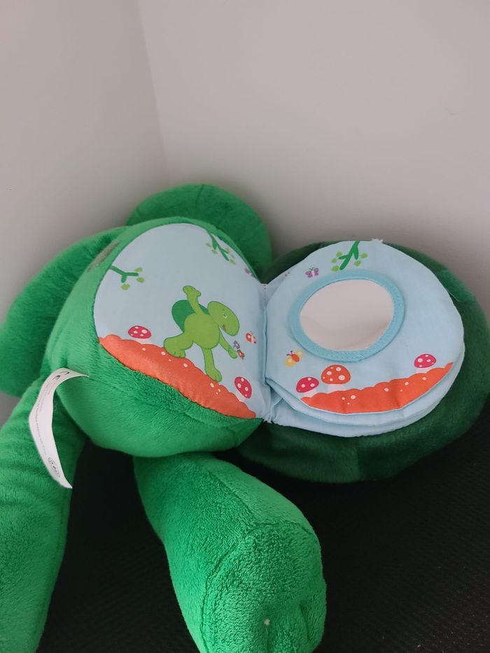 Avec grelot et papier bruissant au niveau du ventre. Elle comporte un livre en tissu dans sa carapace avec un miroir et une histoire tout en images 126