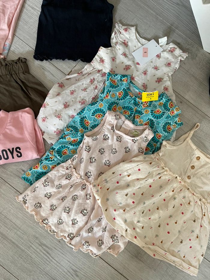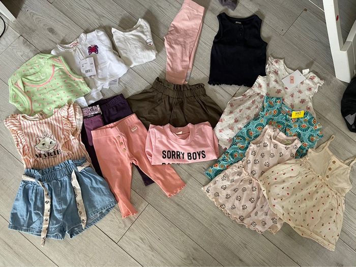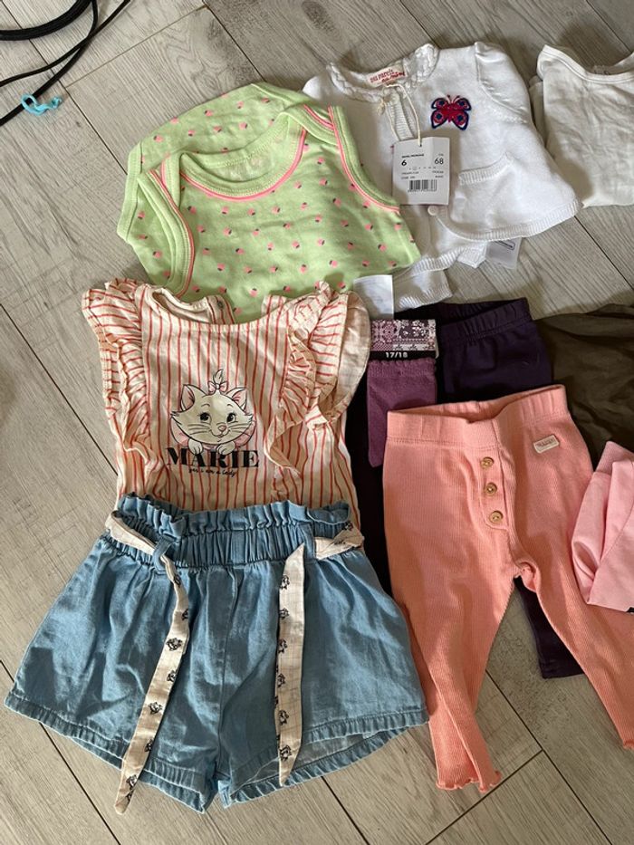 Lots vêtement 3 mois 4 robes dont 1 h et m avec étiquette et une tex avec étiquette 1 leggin corail 1 leggin violet neuf Une paire de chaussette neuve Ensemble marie tee shirt short 1 sweat 1 bodie debatdeur 1 débardeur 1 short 1 tee shirt Divers marques Kiabi, du pareil au même etcc