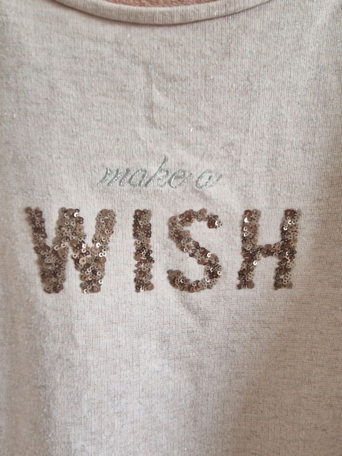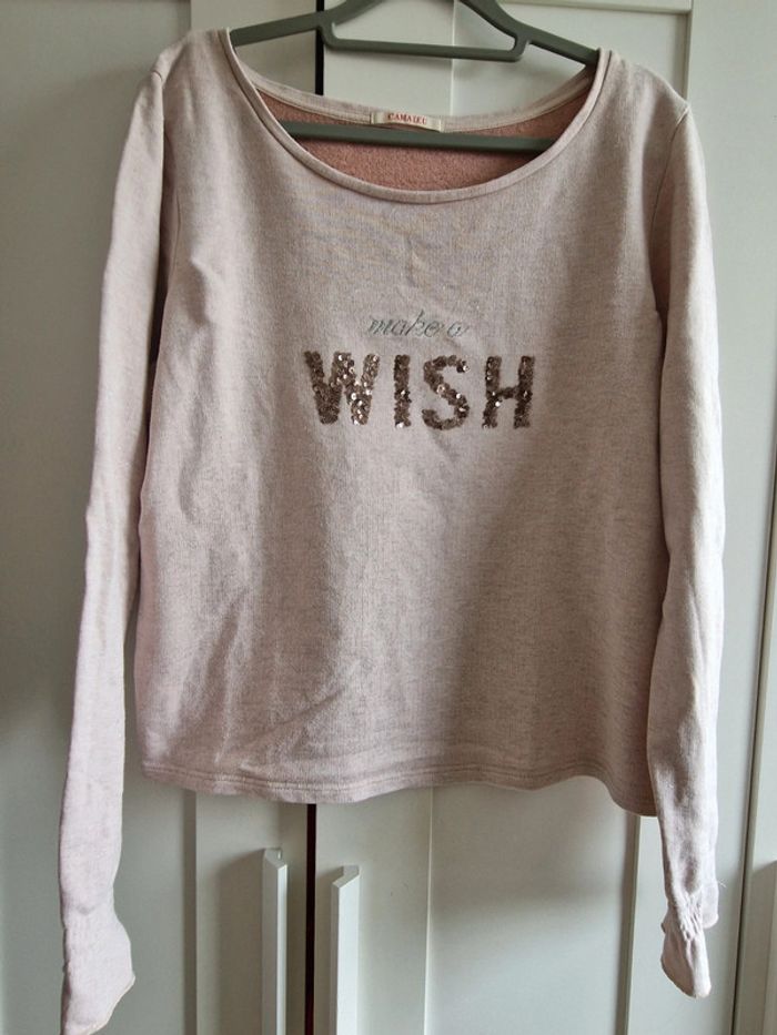Joli sweat fin Camaïeu, rose pâle avec un très léger effet pailleté, taille 40. Message qu'on adore : "Make à wish" (une partie brodée et une partie avec mini-disques : cf. Photos) 🥰 Joli effet en bas des manches, légèrement évasé. Agréable à porter. Très bon état (juste étiquette intérieure coupée car gênante) Envoi rapide Réduction sur les lots