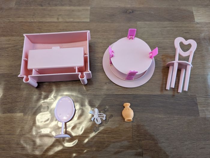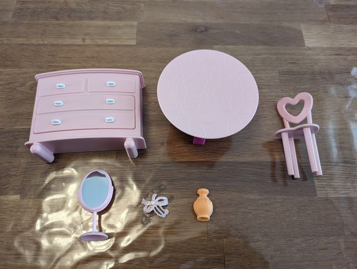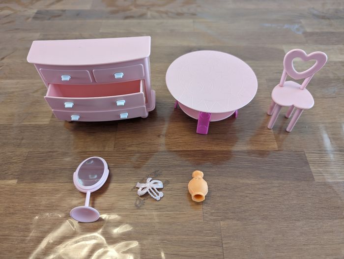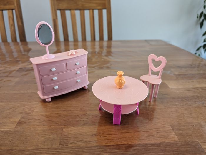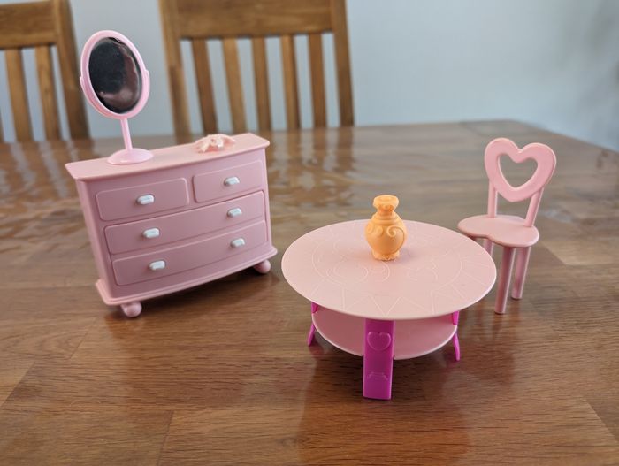 Ensemble de meubles pour poupée 30 cm Très bon état , de micro rayures peuvent être présentes, et le miroir est légèrement décollé en haut. Lot comprenant une commode avec un tiroir qui s'ouvre, une table, une chaise, un miroir, une barrette et un vase. Couleur rose.