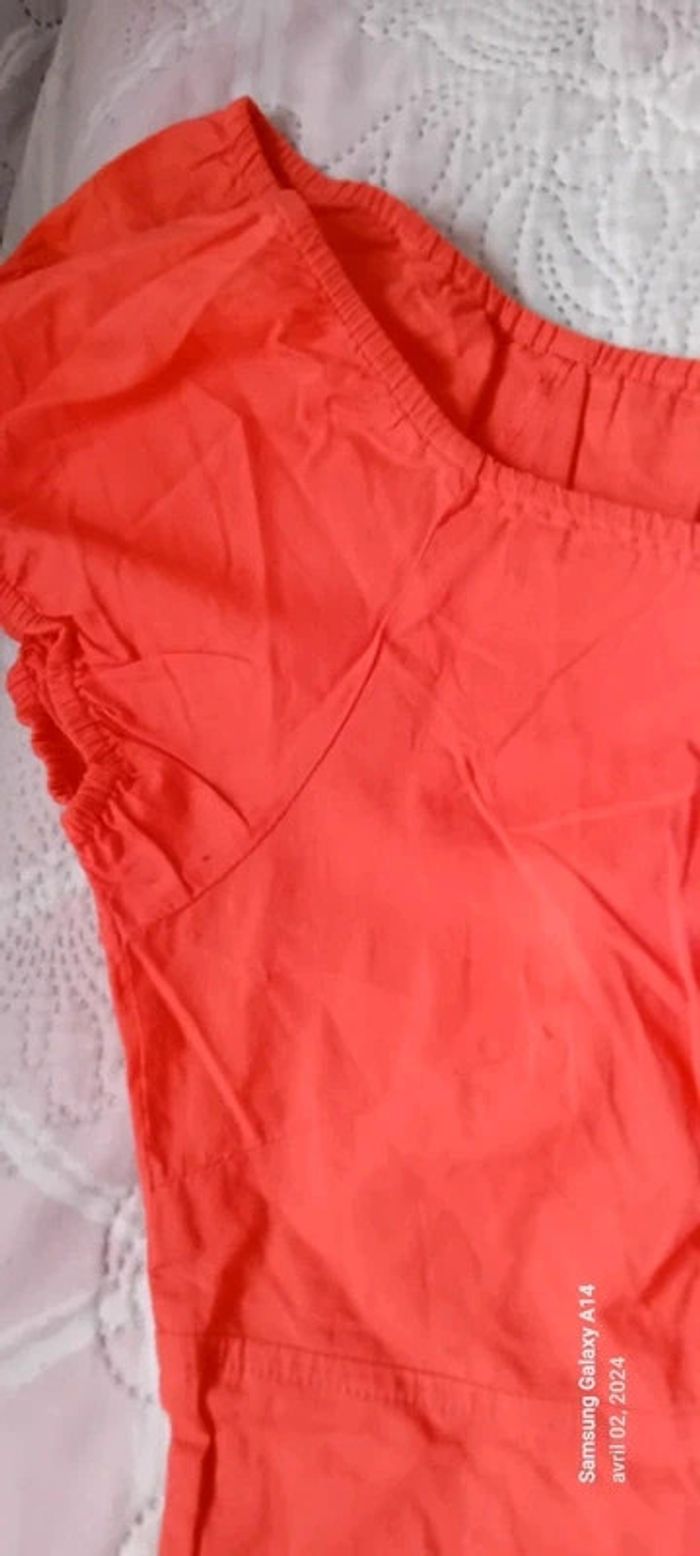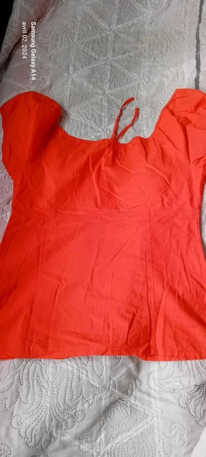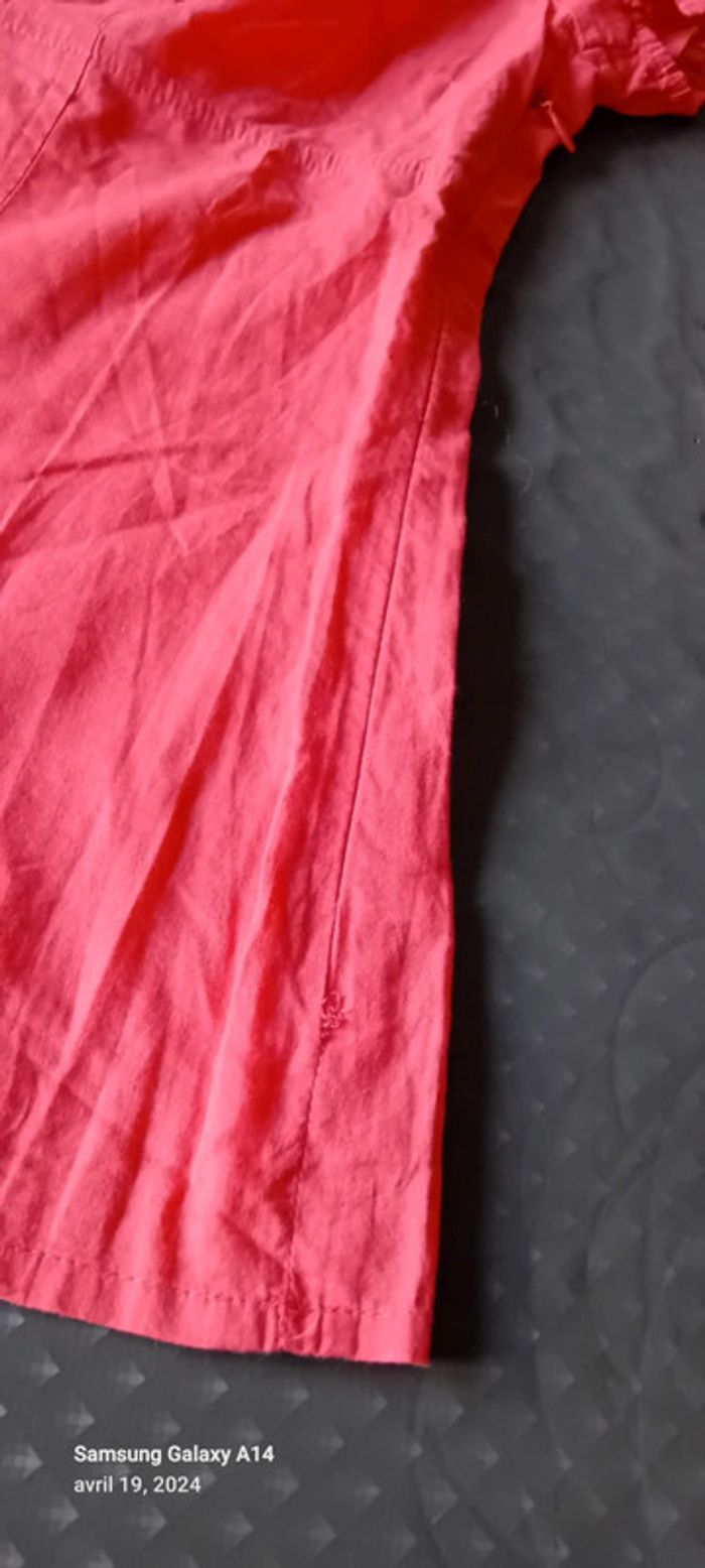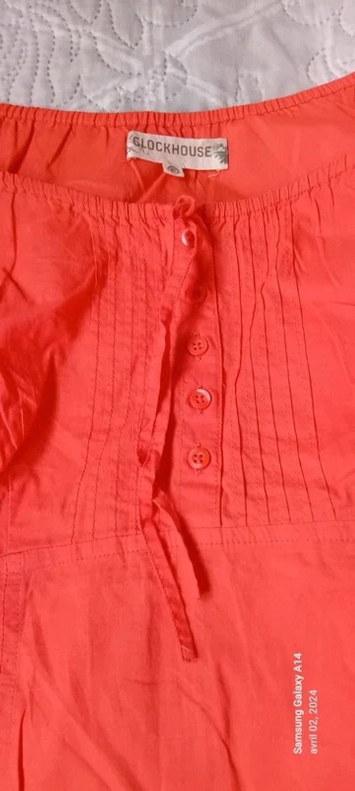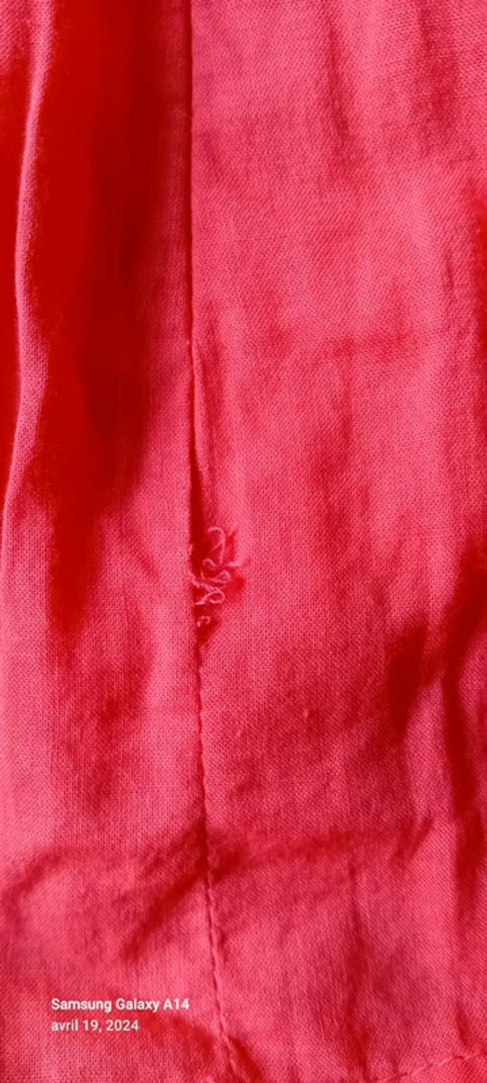 Blouse manches courtes style caraco en coton léger élastique aux manches et au col avec lien de resserage et boutons taille haute cintrée fermeture éclair sur le côté couleur corail tirant sur le rose(se fier à la première photo pour la bonne couleur) longueur 64cm largeur aisselles à aisselles 45 cm largeur épaules 38 cm peu porté en très bon état ⚠️ juste quelques fils tirés et decousus au niveau de la couture sur le côté (voir dernières photos) #midole #midolefemme44 #hautcaraco #clockhouse #femmeXL