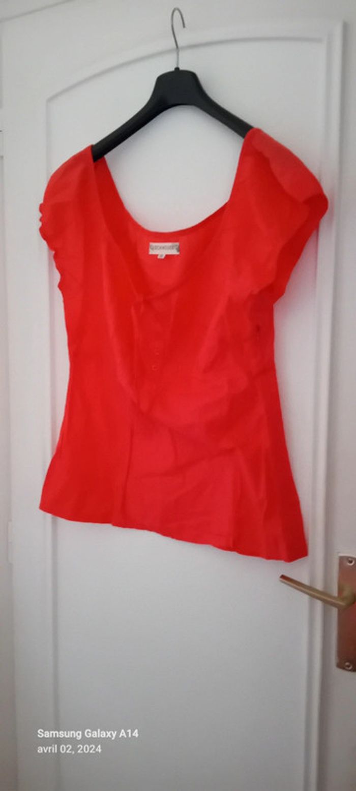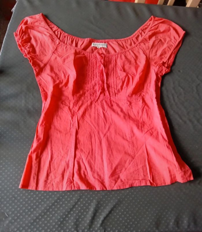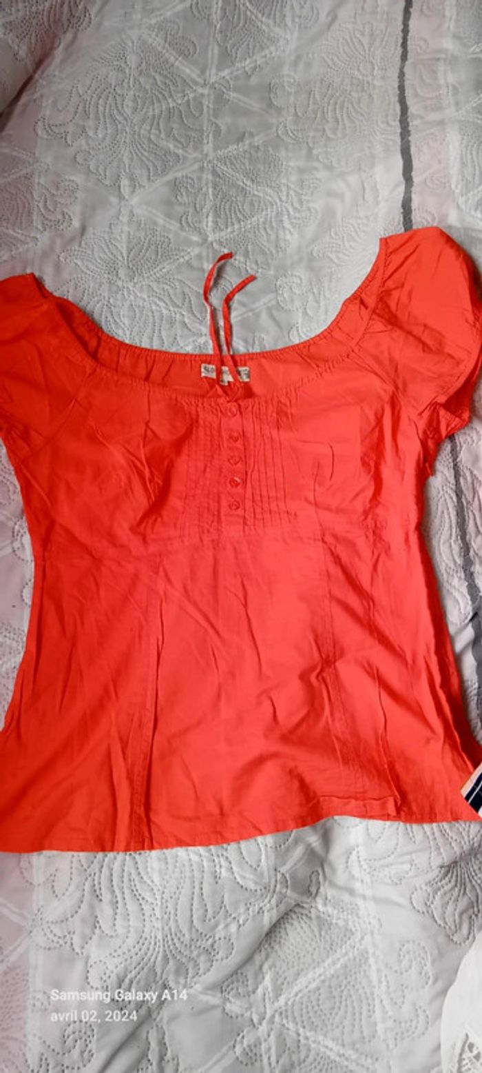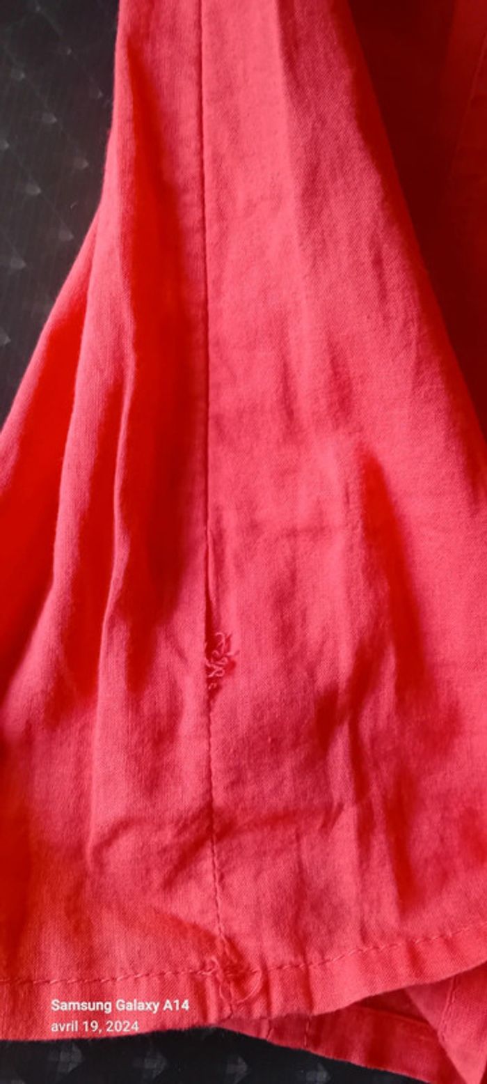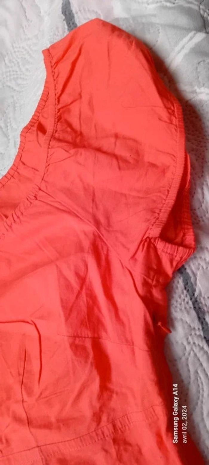 Blouse manches courtes style caraco en coton léger élastique aux manches et au col avec lien de resserage et boutons taille haute cintrée fermeture éclair sur le côté couleur corail tirant sur le rose(se fier à la première photo pour la bonne couleur) longueur 64cm largeur aisselles à aisselles 45 cm largeur épaules 38 cm peu porté en très bon état ⚠️ juste quelques fils tirés et decousus au niveau de la couture sur le côté (voir dernières photos) #midole #midolefemme44 #hautcaraco #clockhouse #femmeXL
