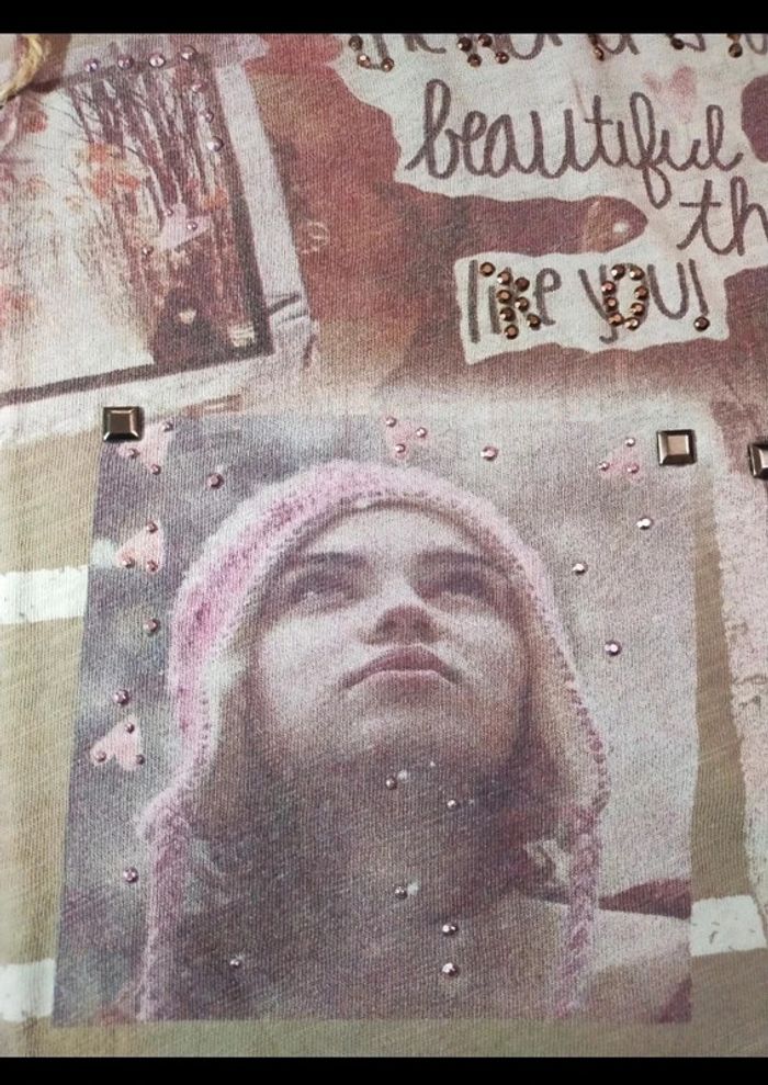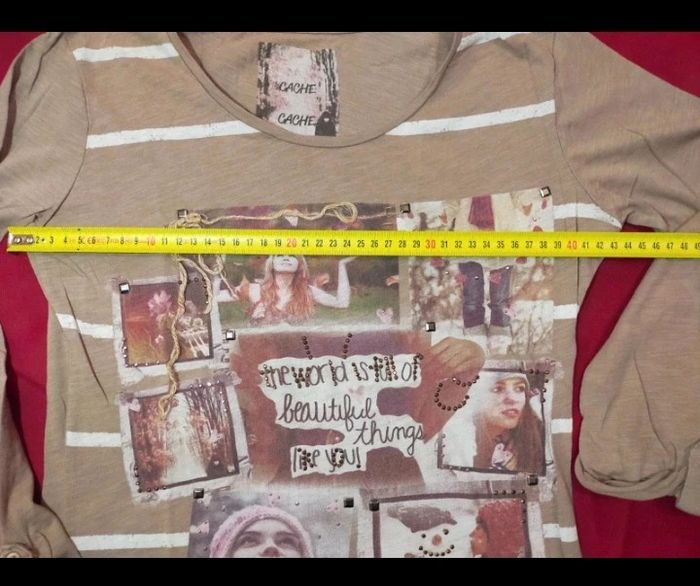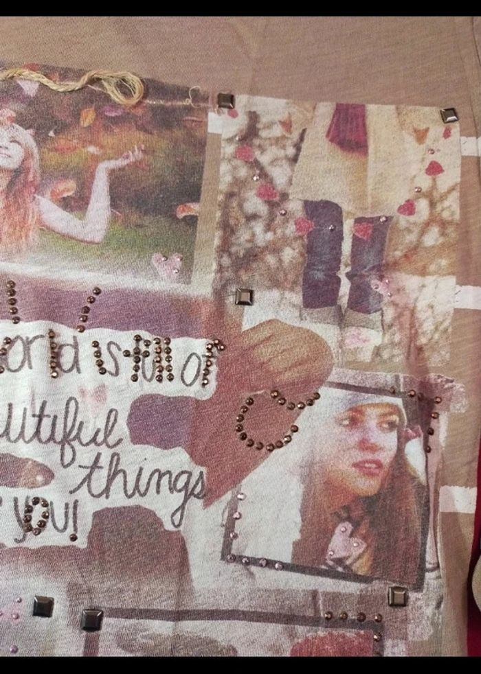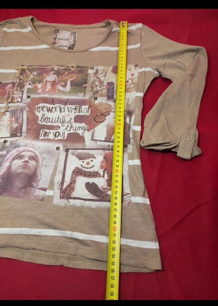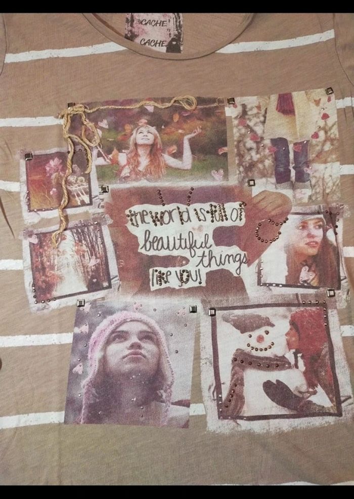 T-shirt marron clair manches longues. Imprimé avec des photos des 4 saison. Avec des strass. Taille 36 cache cache